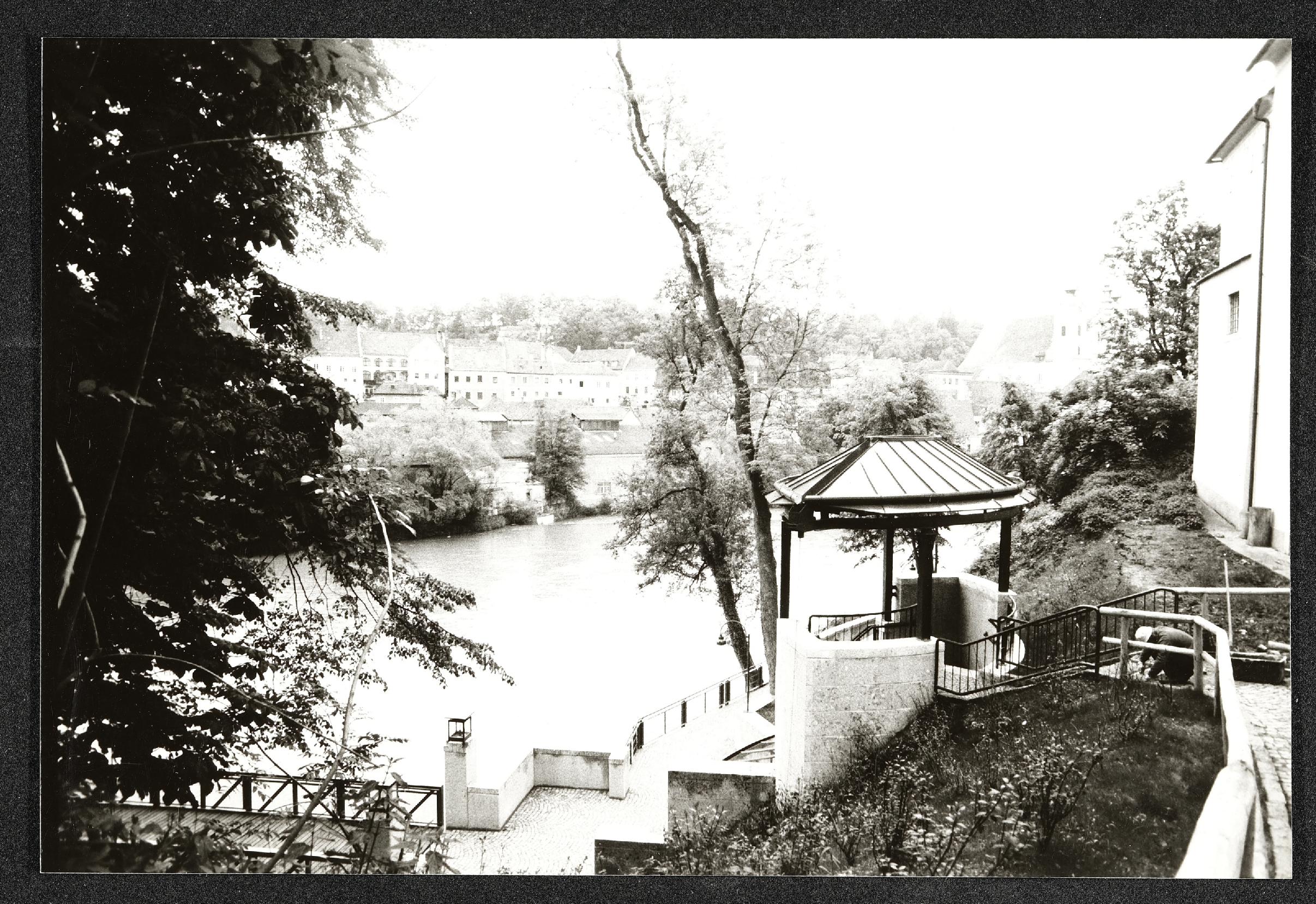 | Beschreibung | 1987 Landesausstellung "Arbeit Mensch Maschine: Der Weg in die Industriegesellschaft". Blick von der Stiege, die vom Schloss Lamberg hinunter zum Museumssteg führt, Richtung Steyrdorf. |