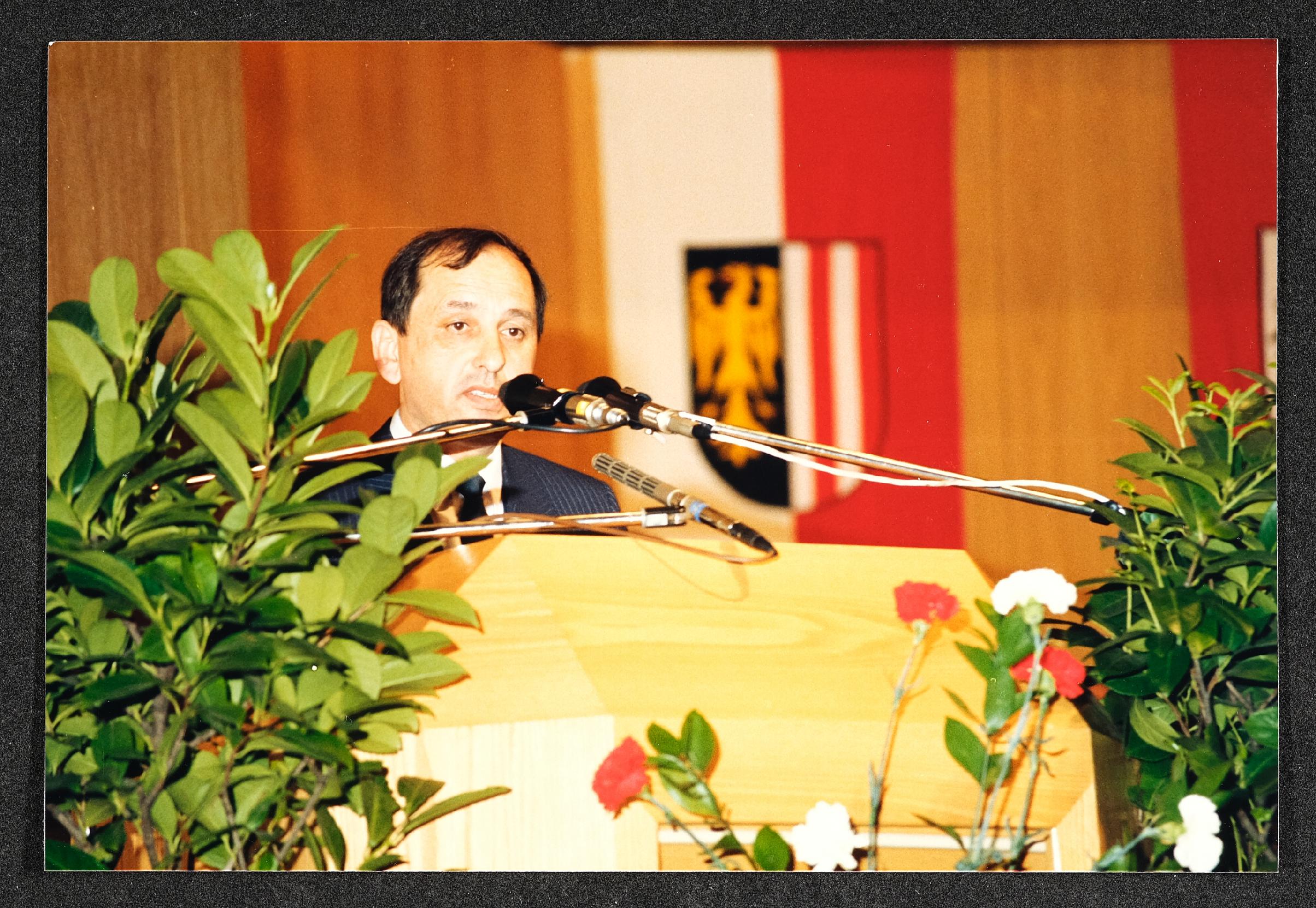| Beschreibung | Festakt am 30. April 1987 im Stadtsaal Steyr anlässlich der Eröffnung der Landesausstellung 1987 "Arbeit Mensch Maschine: Der Weg in die Industriegesellschaft" im Museum Industrielle Arbeitswelt Steyr. |