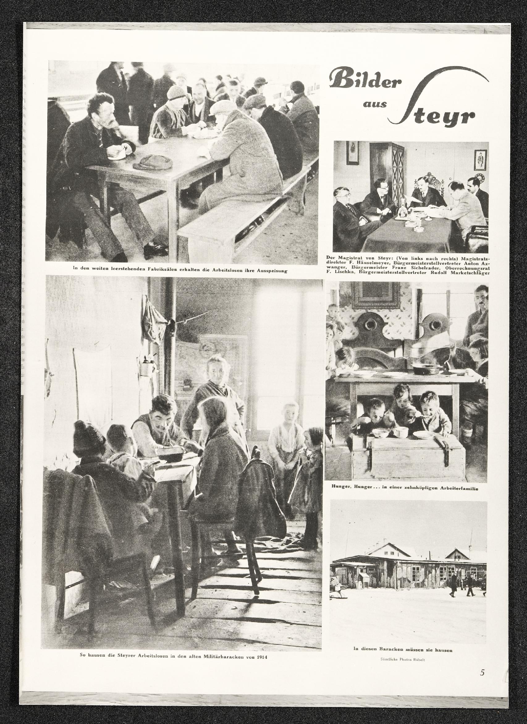 | Beschreibung | Artikel über die Arbeitslosigkeit in Steyr, erschienen in der Zeitschrift Der Kuckuck, im rechten oberen Bild ist der Bürgermeister Franz Sichlrader zu sehen |