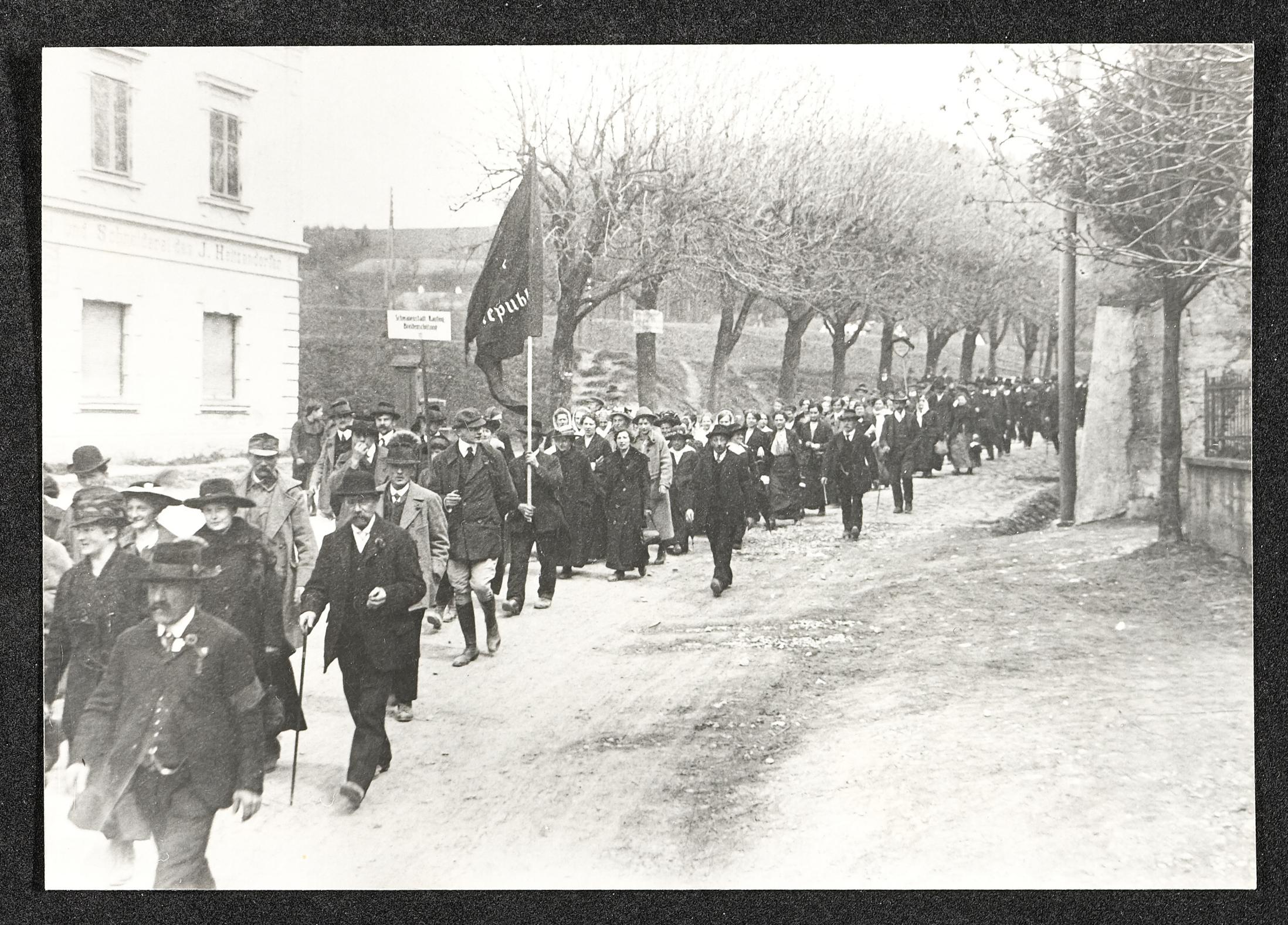 | Beschreibung | Am 1. Mai 1919 findet in Vöcklabruck ein Sternmarsch statt, der in den gemeinsamen Maiaufmarsch mündet. Hier ist der Teil des Sternmarsches durch die Bahnhofstraße zu sehen. |