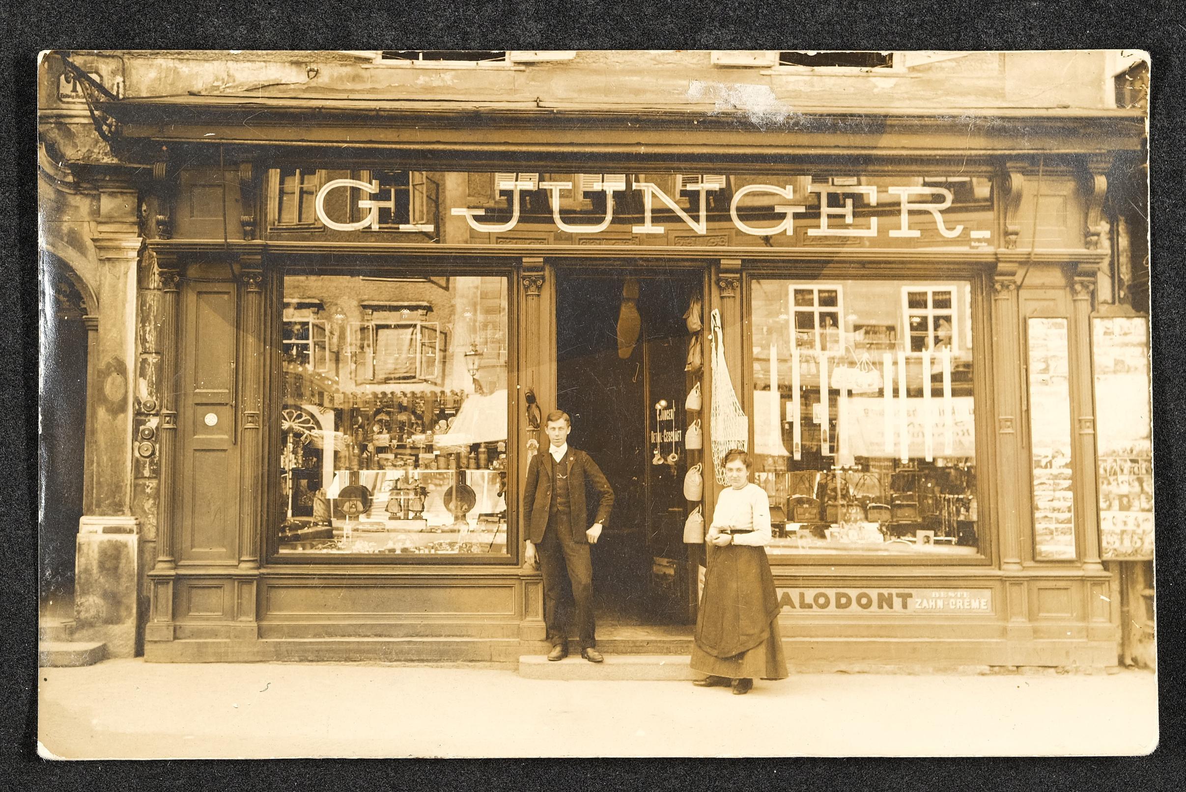 | Beschreibung | Diese Ansichtskarte zeigt den Kaufladen von G. Junger. Weitere Informationen sind nicht vorhanden. |