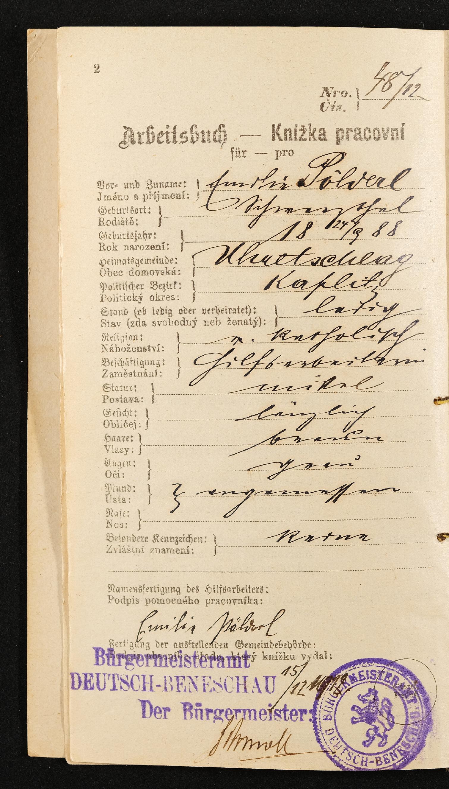 | Beschreibung | Arbeitsbuch der Hilfsarbeiterin Emilie Pölderl, beschäftigt in der Zwirnknopffabrik William Prym in Deutsch-Beneschau, 28. Oktober 1912 bis 9. Juni 1914 |