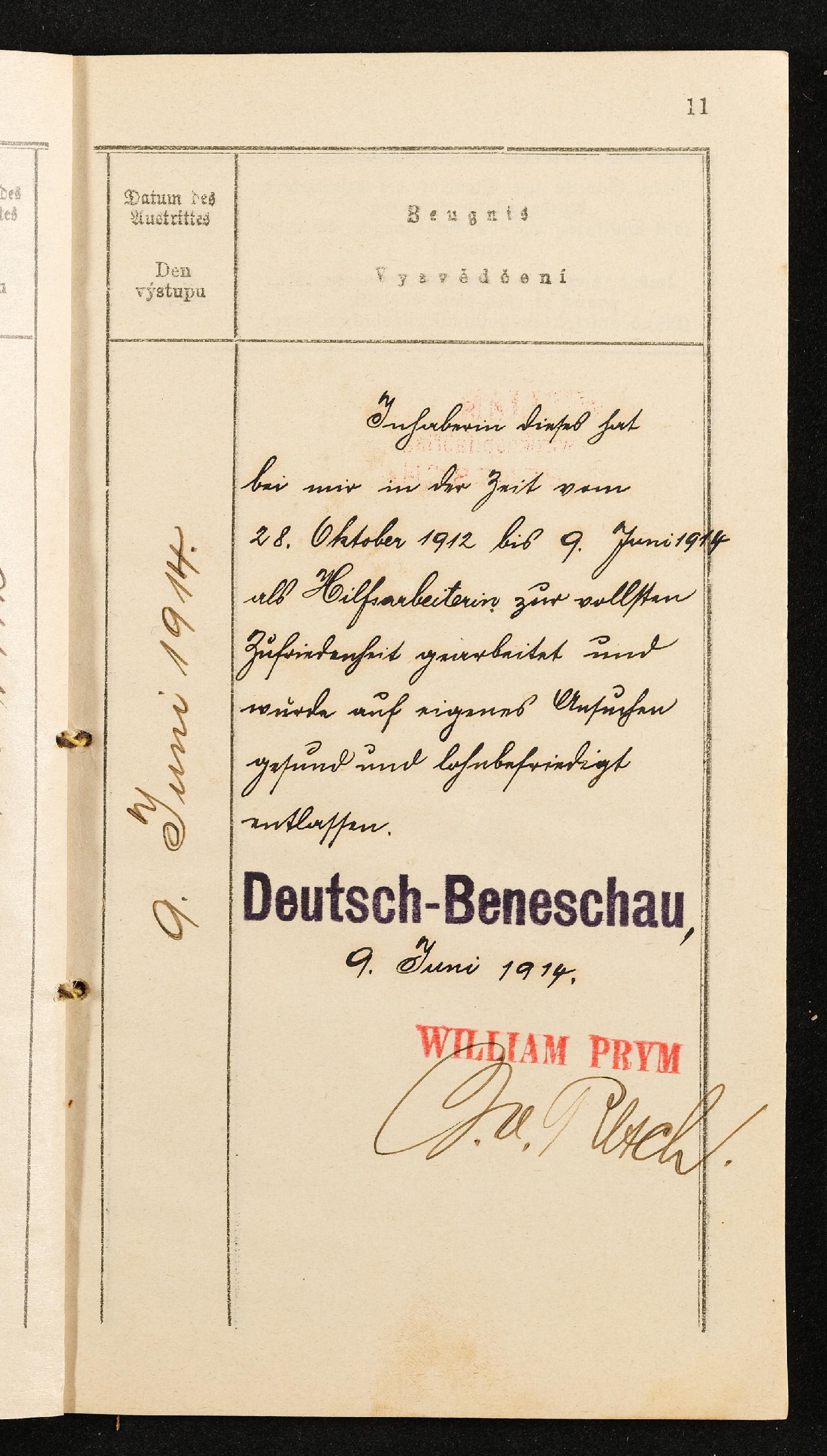 | Beschreibung | Arbeitsbuch der Hilfsarbeiterin Emilie Pölderl, beschäftigt in der Zwirnknopffabrik William Prym in Deutsch-Beneschau, 28. Oktober 1912 bis 9. Juni 1914 |