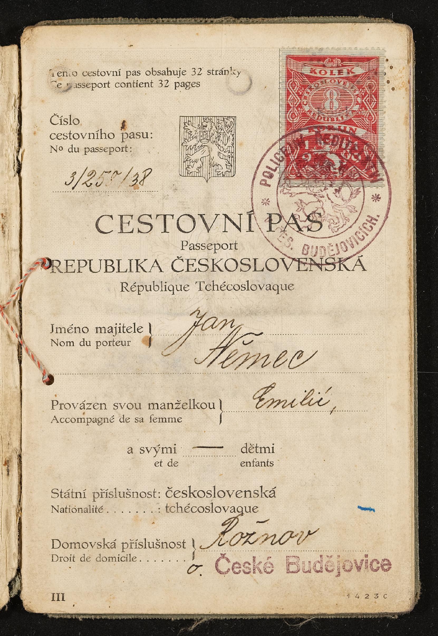 | Beschreibung | Reisepass Jan (Johann) und Emilie Nemec (geb. Pölderl), Tschechoslowakische Republik, ausgestellt am 6. Mai 1938 in Budweis |