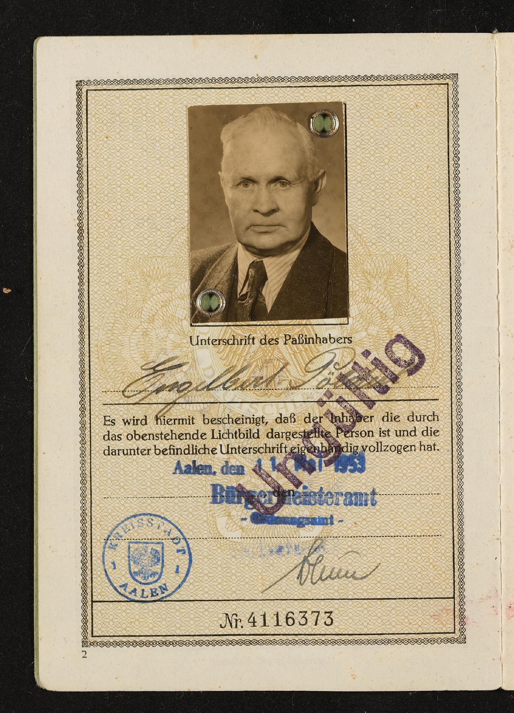 | Beschreibung | Reisepass Engelbert Pölderl, Postbetriebsassistent, Bundesrepublik Deutschland, ausgestellt am 11. Mai 1953 in Aalen |