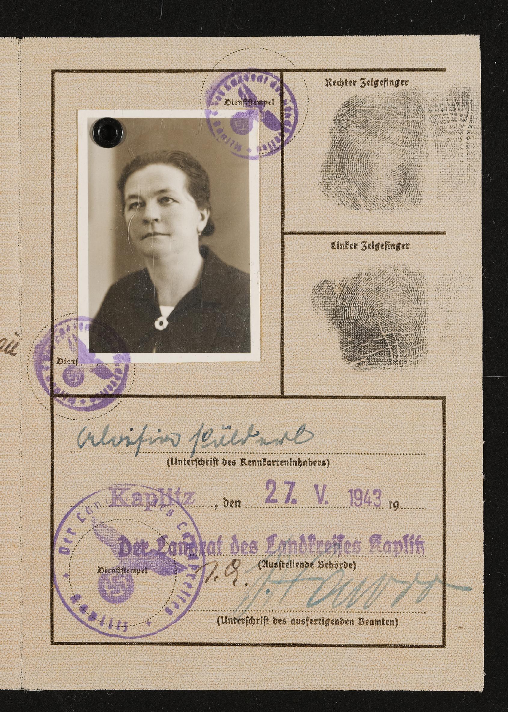 | Beschreibung | Kennkarte Deutsches Reich, Aloisia Pölderl (geb. Schuh), ausgestellt am 27. Mai 1943 in Kaplitz |