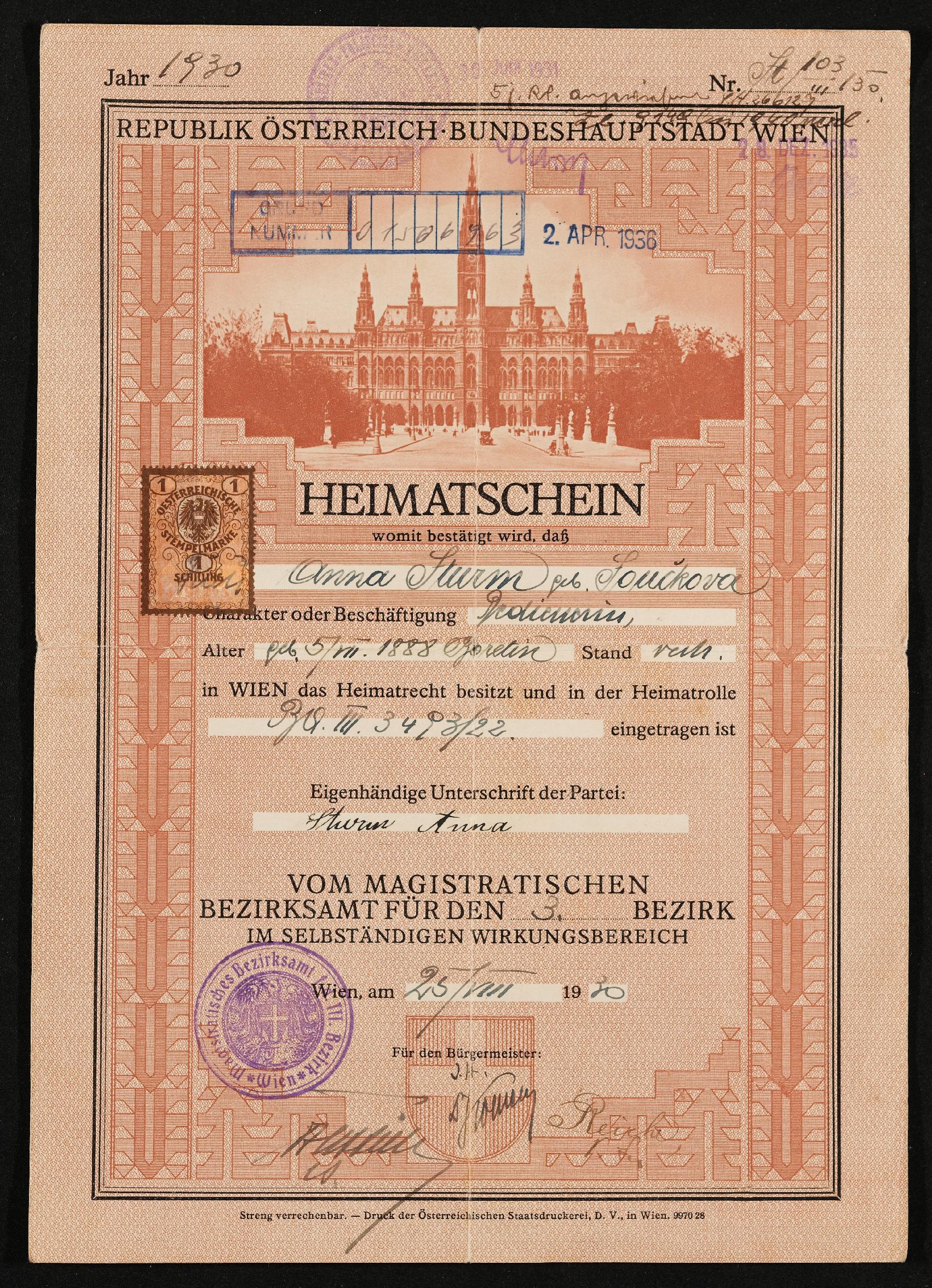 | Beschreibung | Heimatschein Anna Sturm, Wien am 25. August 1930 |