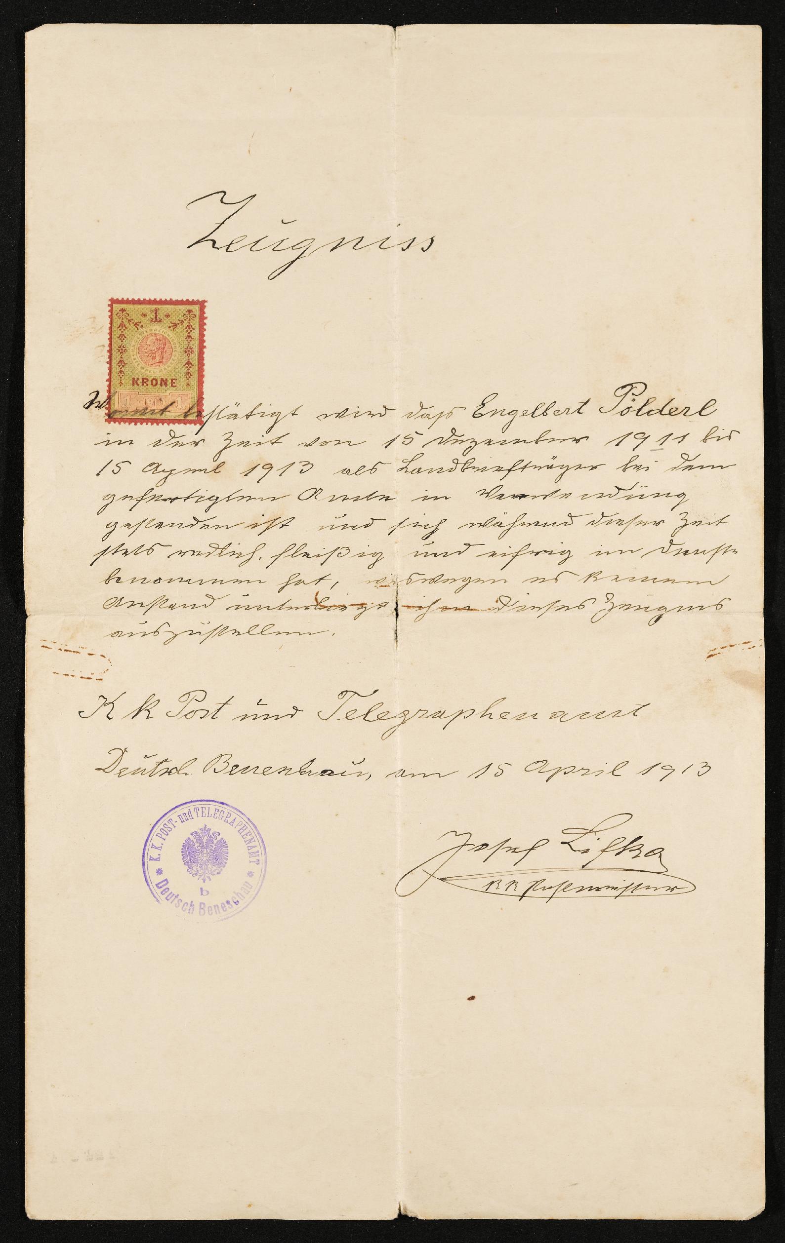 | Beschreibung | Dienstzeugnis k. k. Post- und Telegraphenamt, Engelbert Pölderl, Deutsch Beneschau am 15. April 1913 |
