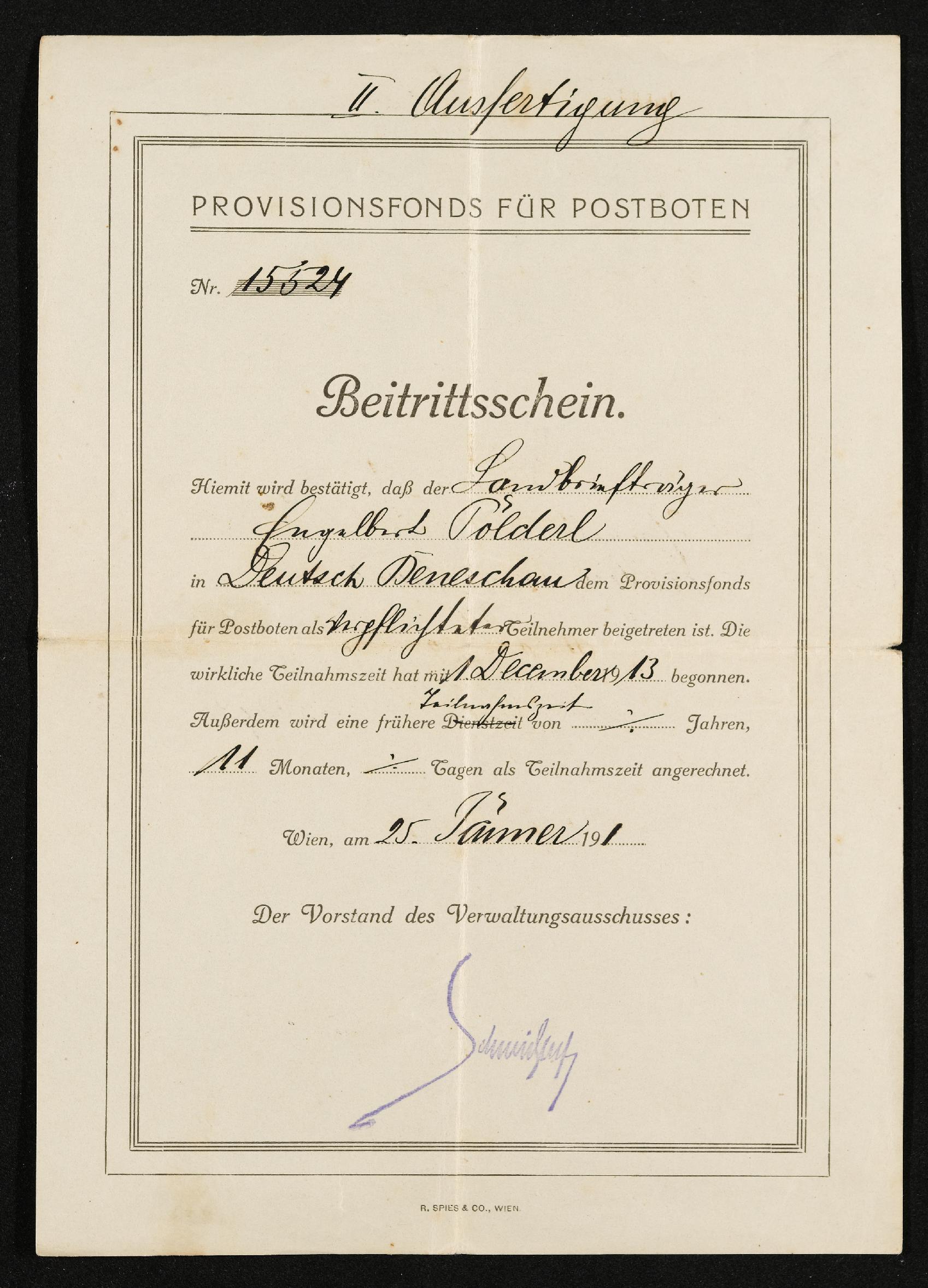 | Beschreibung | Beitrittsschein Provisionsfonds für Postboten, Landbriefträger Engelbert Pölderl, Wien, 25. Jänner 1914 |