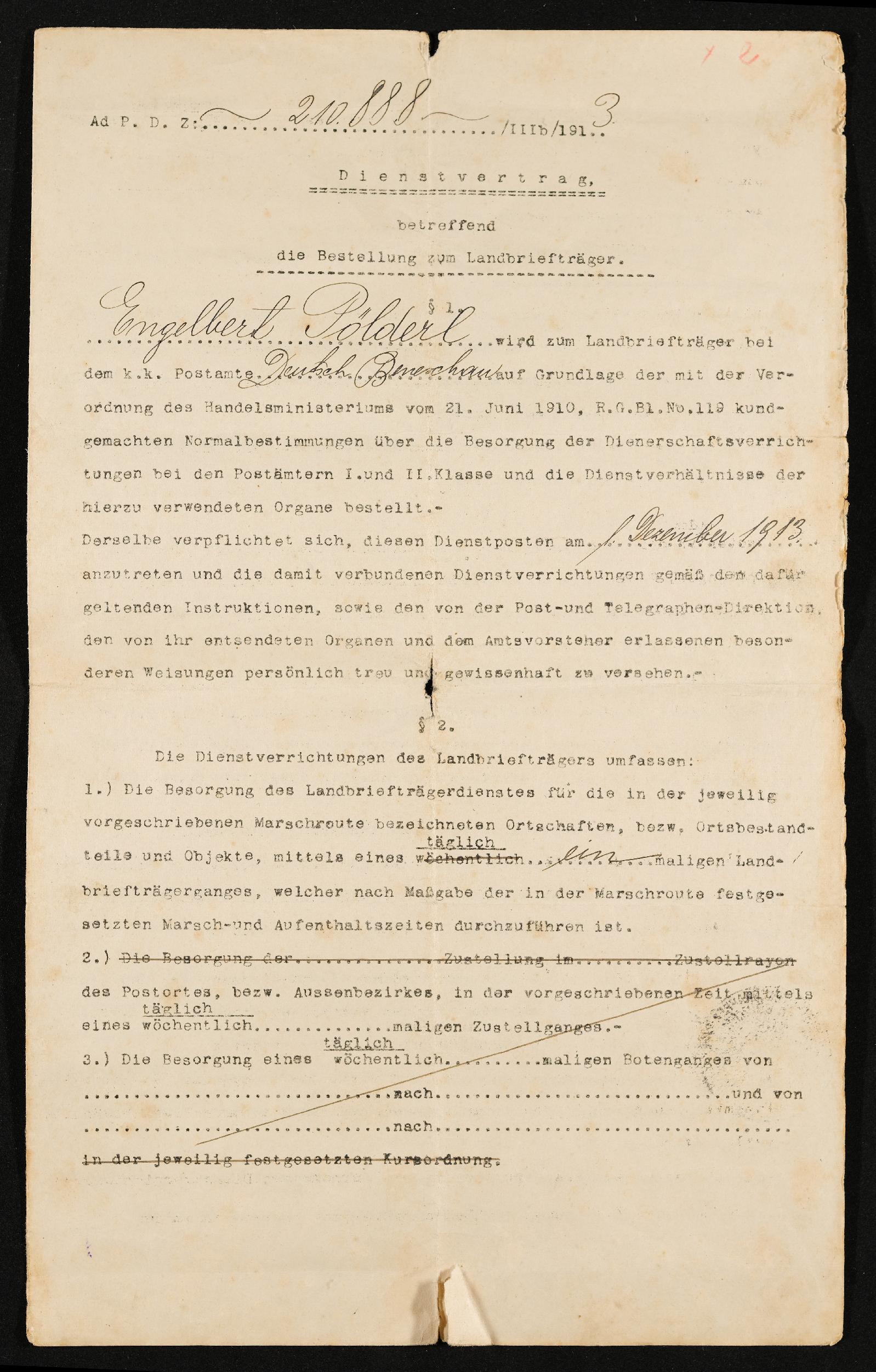 | Beschreibung | Dienstvertrag betreffend Bestellung zum Landbiefträger, Engelbert Pölderl, Deutsch Beneschau, am 11. Dezember 1913 |