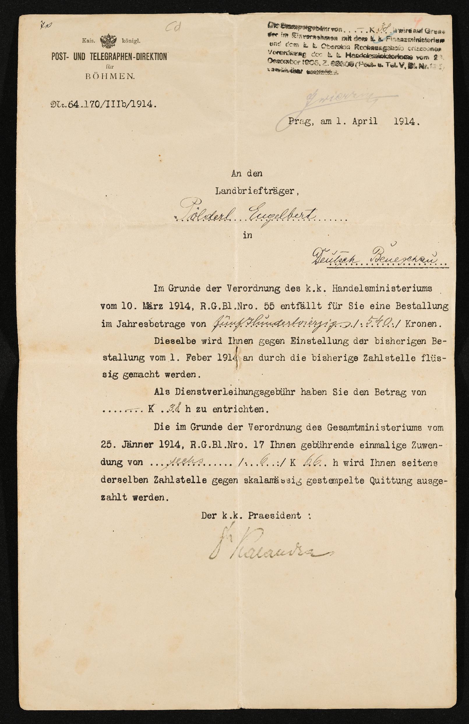 | Beschreibung | Schreiben der k. k. Post- und Telegraphen-Direktion für Böhmen an Engelbert Pölderl, Prag, 1. April 1914 |