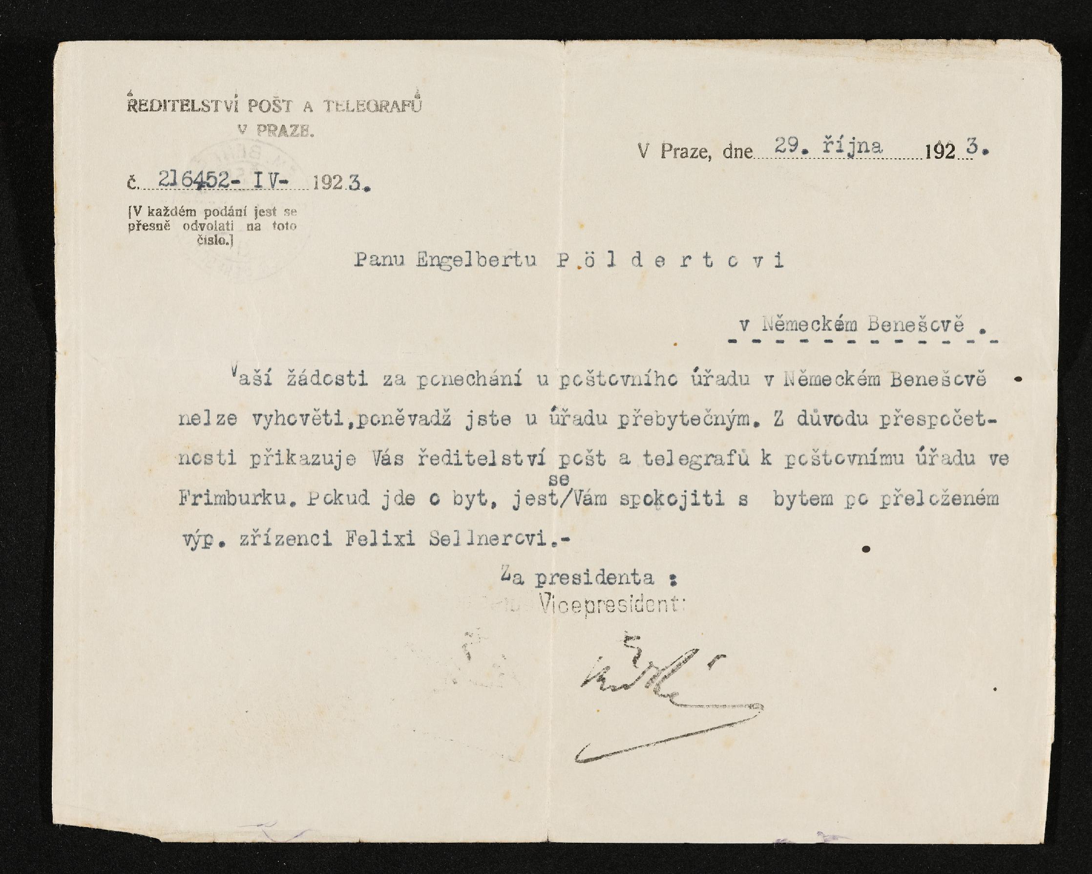 | Beschreibung | Schreiben an Engelbert Pölderl, Prag, 29. Oktober 1923 |