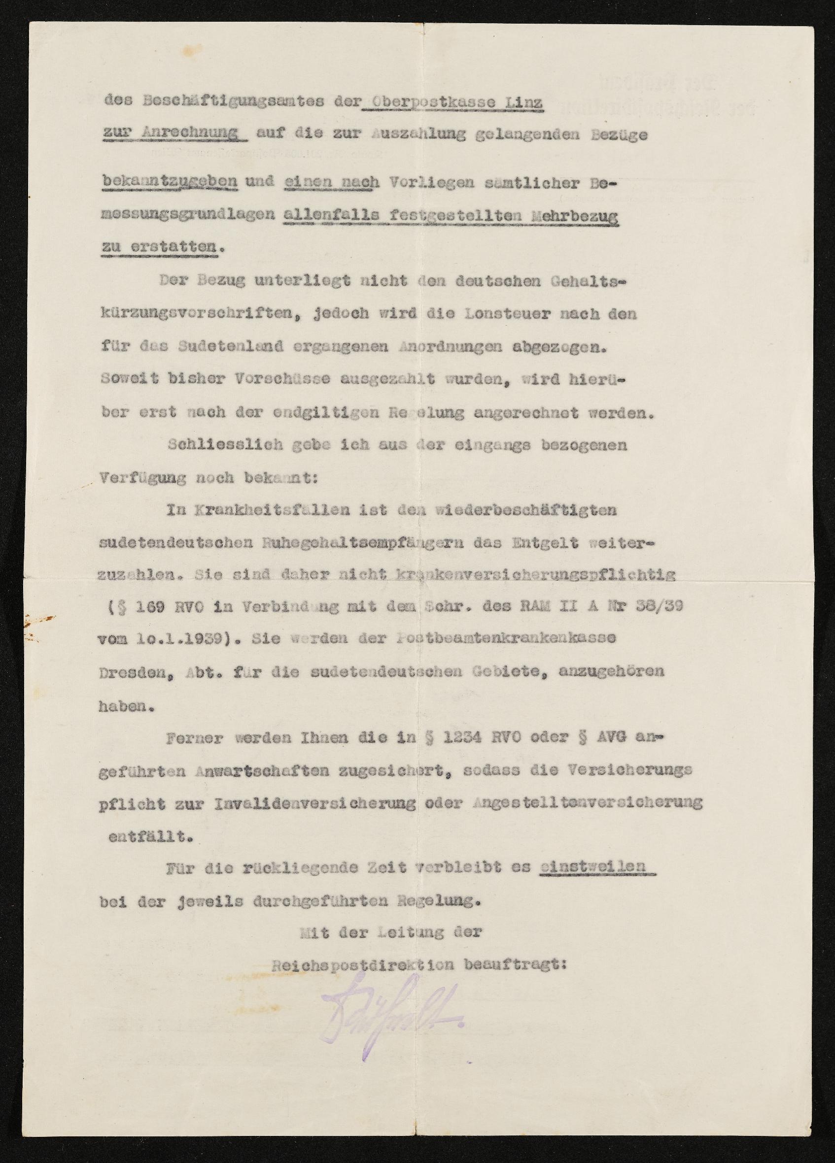 | Beschreibung | Schreiben der Reichspostdirektion Linz an Engelbert Pölderl, Entgeltregelung, 25. Februar 1939 |