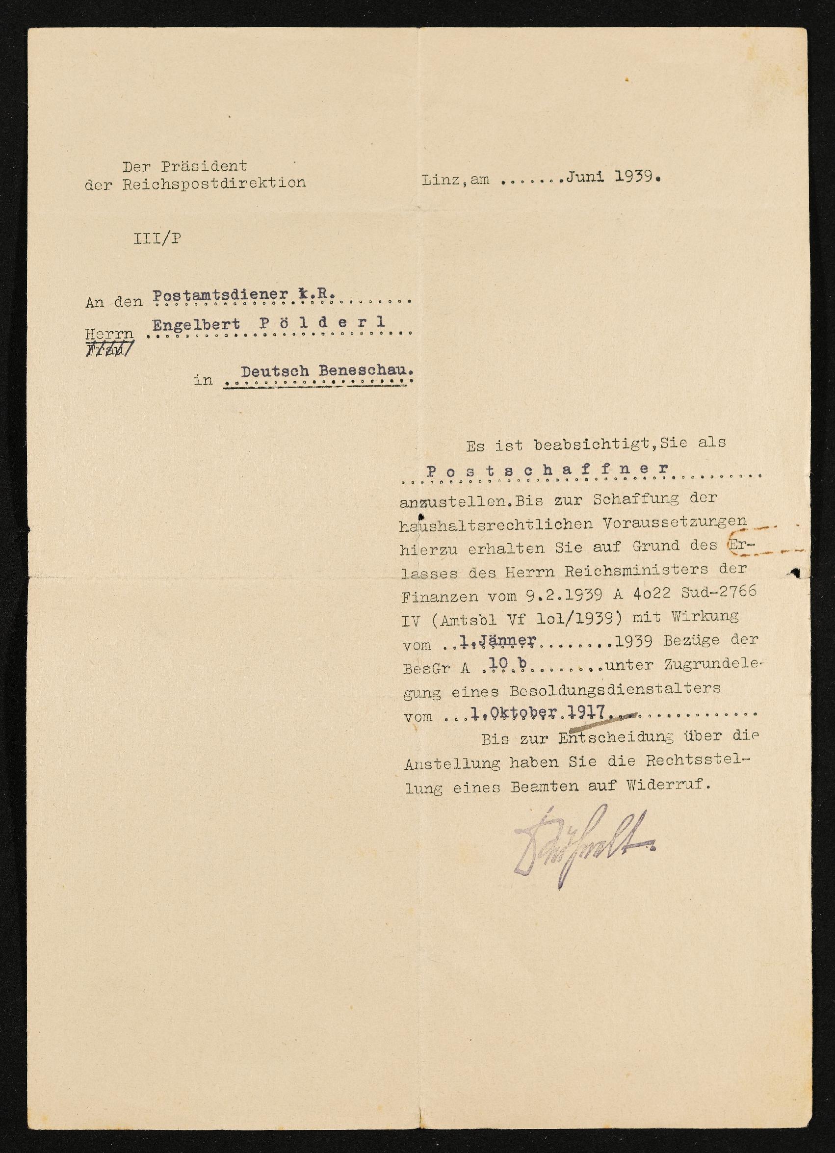 | Beschreibung | Schreiben der Reichspostdiektion Linz an Engelbert Pölderl, Einstellung als Postschaffner, Juni 1939 |
