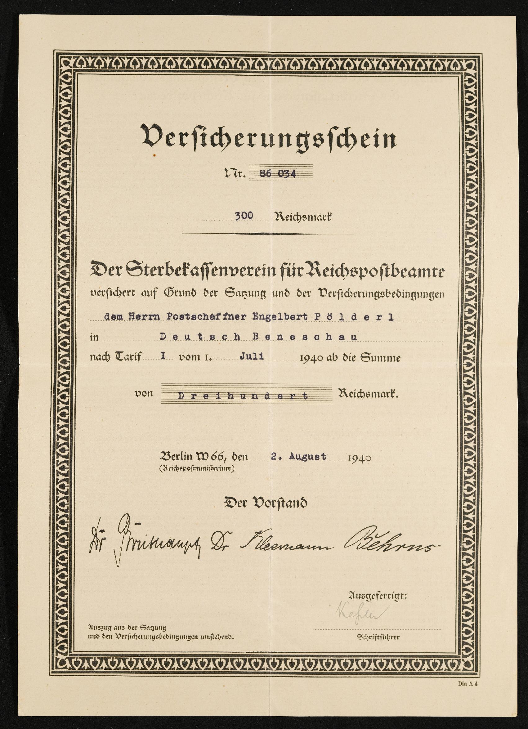 | Beschreibung | Versicherungsschein des Sterbekassenvereins für Reichspostbeamte für Postschaffner Engelbert Pölderl, Berlin, 2. August 1940 |