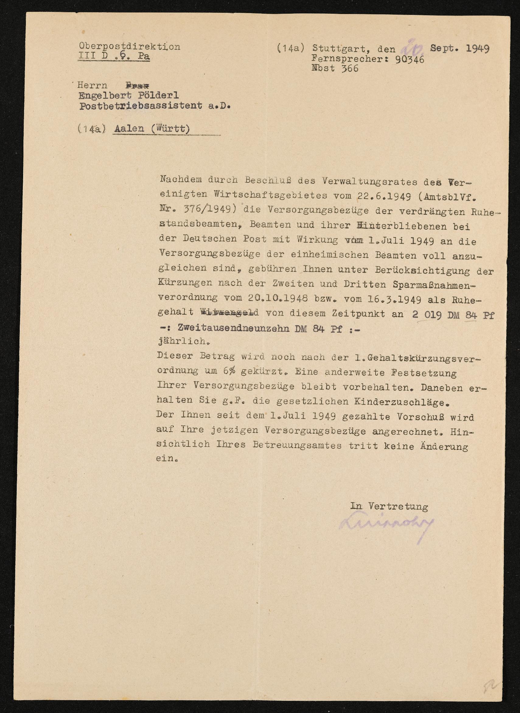 | Beschreibung | Schreiben der Oberpostdirektion an den Postbetriebsassistenten a. D. Engelbert Pölderl, Bezügeregelung, Stuttgart, 20. September 1949 |
