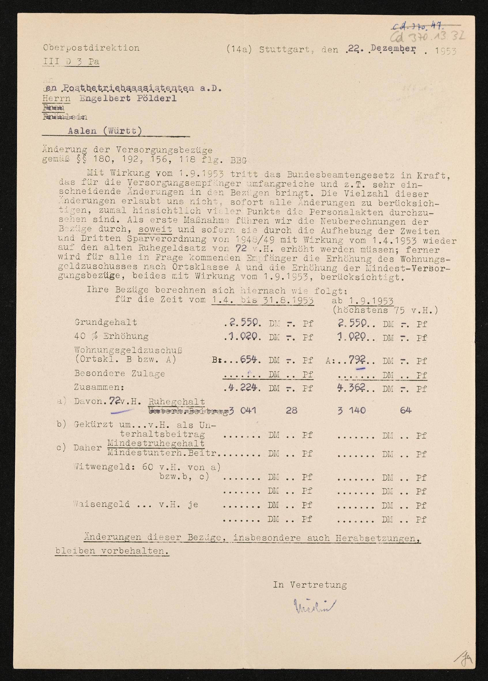 | Beschreibung | Schreiben der Oberpostdirektion an den Postbetriebassistenten a.D. Engelbert Pölderl, Änderung der Versorgungsbezüge, Stuttgart 22. Dezember 1953 |