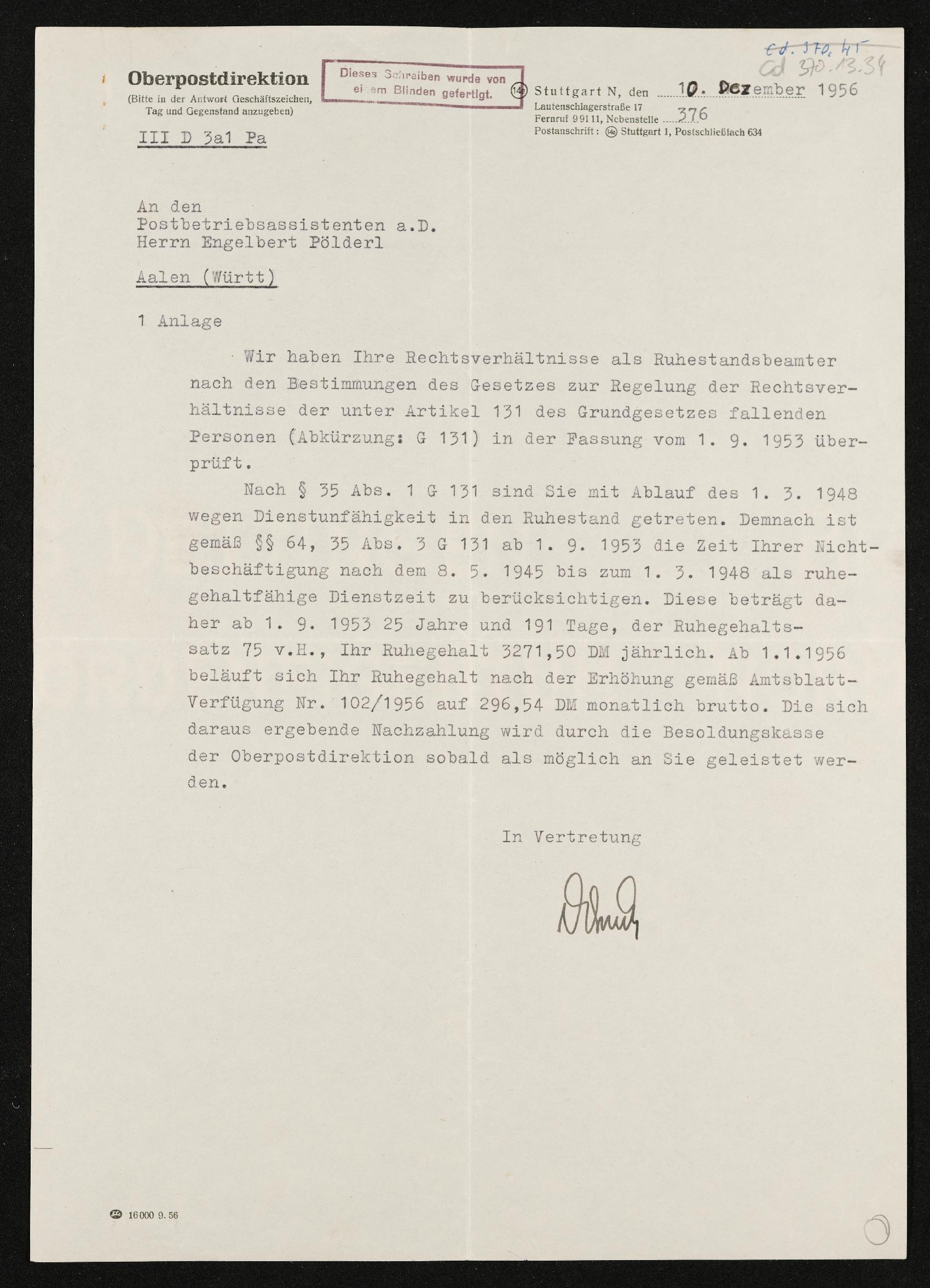 | Beschreibung | Schreiben der Oberpostdirektion an den Postbetriebsassistenten a. D. Engelbert Pölderl, Überprüfung der Rechtsverhältnisse als Ruhestandsbeamter, Stuttgart, 10. Dezember 1956 |