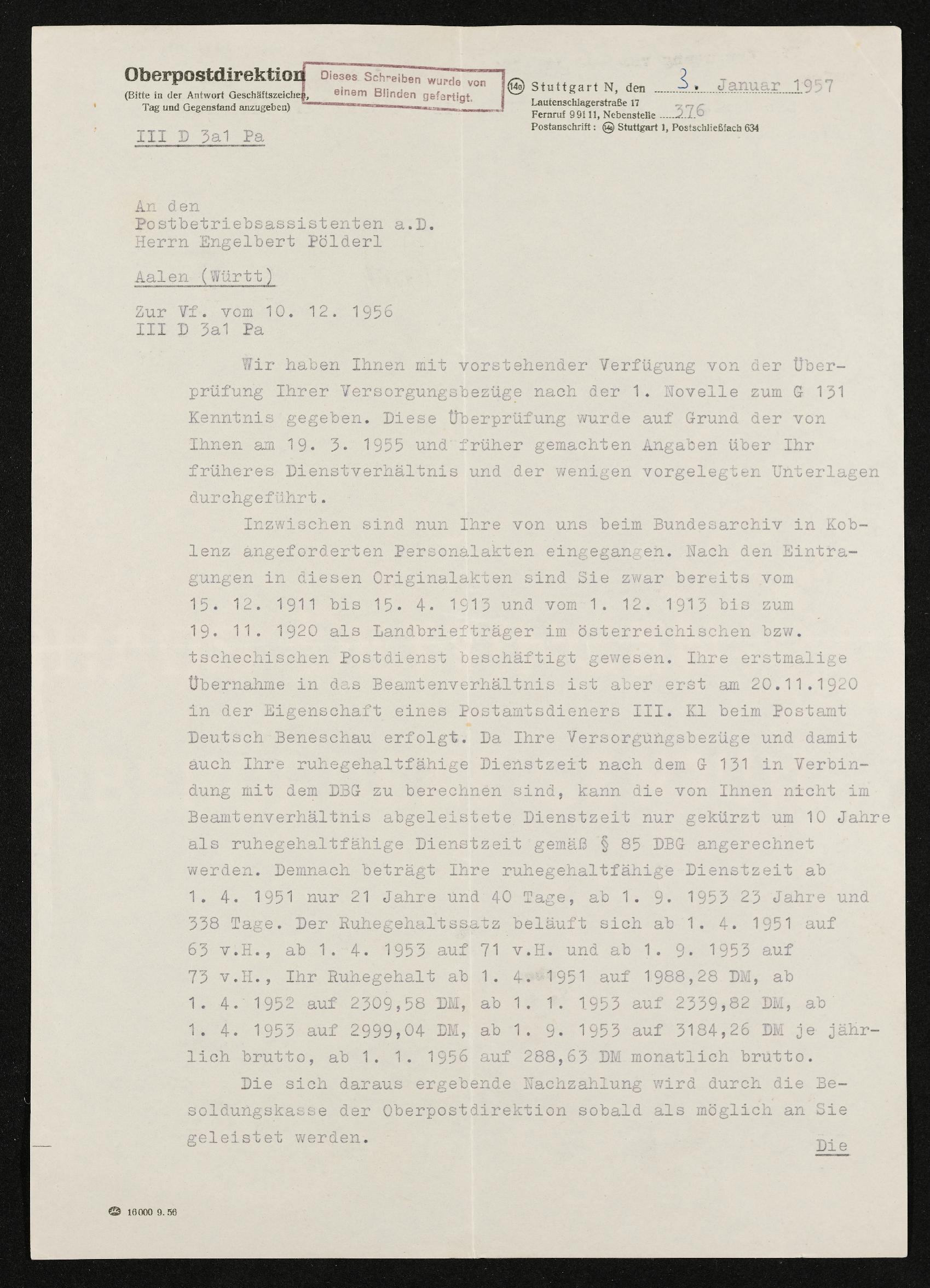| Beschreibung | Schreiben der Oberpostdirektiom an den Postbetriebsassistenten a.D. Engelbert Pölderl, Berechnung Nachzahlung Versorgungsbezüge, Stuttgart, 3. Jänner 1957 |