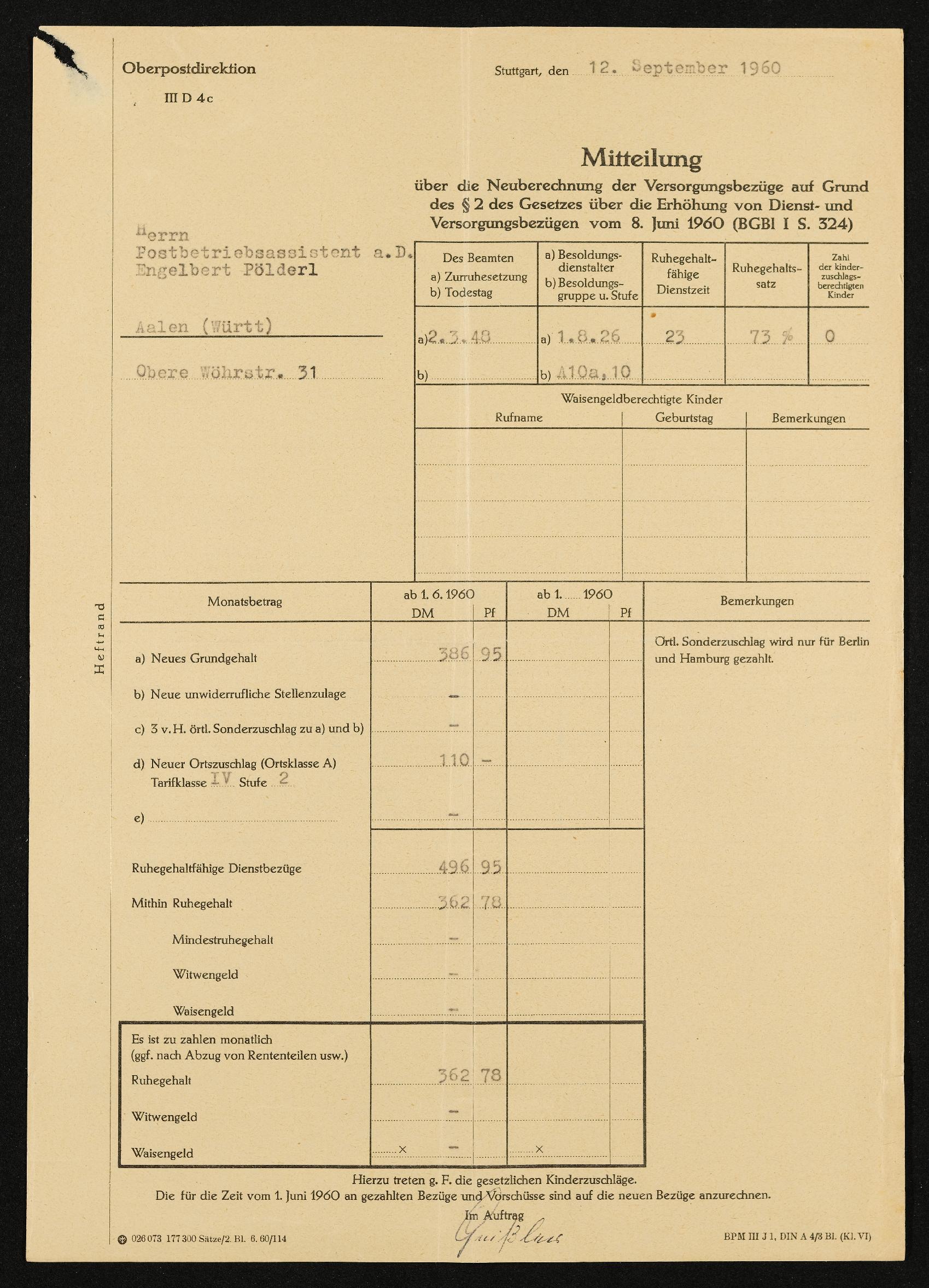 | Beschreibung | Mitteilung über die Neuberechnung der Versorgungsbezüge vom 8. Juni 1960, ausgetsellt für Postbetriebsassistent a.D. Engelbert Pölderl , Stuttgart, 12. September 1960 |