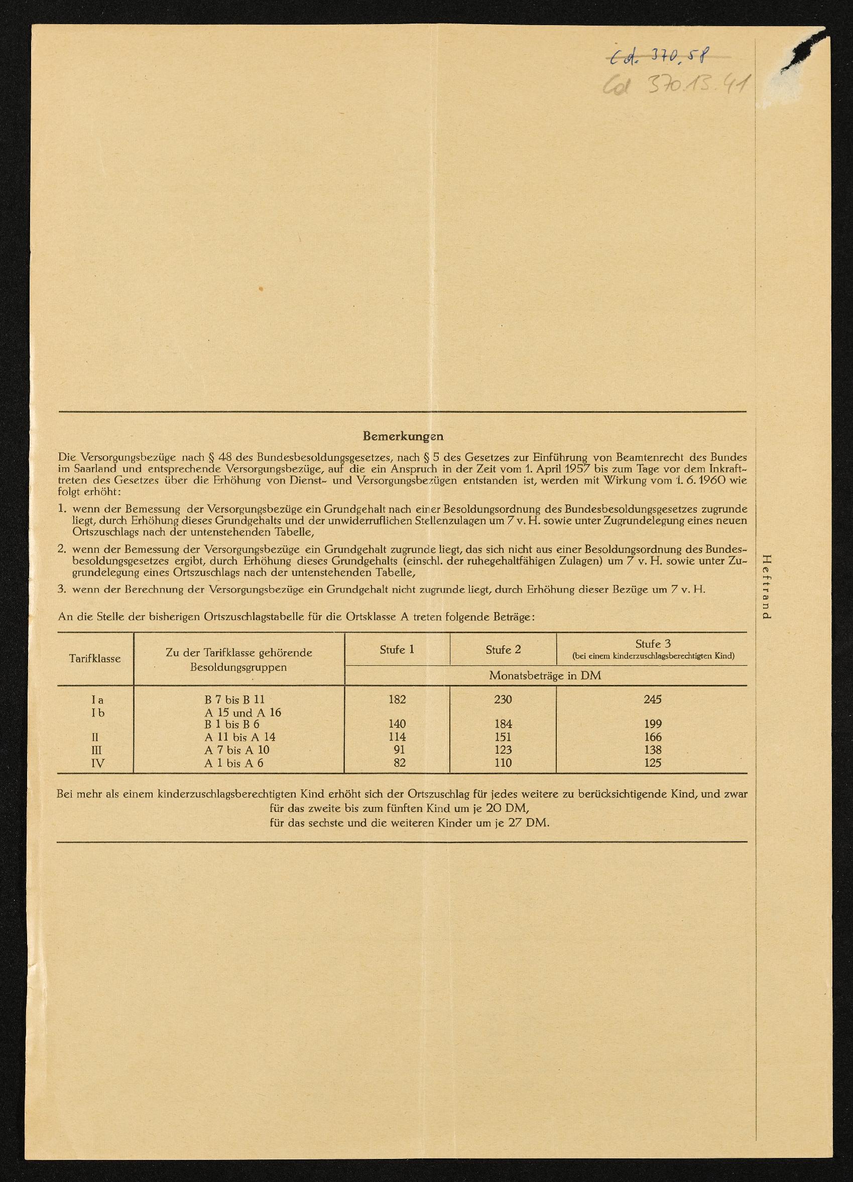 | Beschreibung | Mitteilung über die Neuberechnung der Versorgungsbezüge vom 8. Juni 1960, ausgetsellt für Postbetriebsassistent a.D. Engelbert Pölderl , Stuttgart, 12. September 1960 |