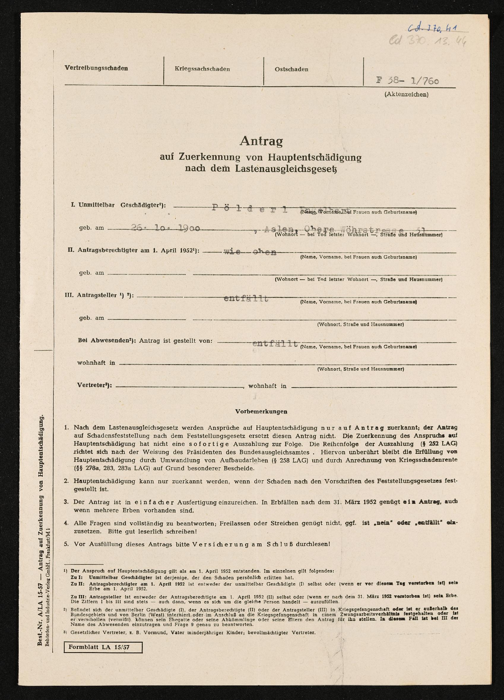 | Titel | Antrag Hauptentschädigung nach Lastenausgleichsgesetz Engelbert Pölderl |