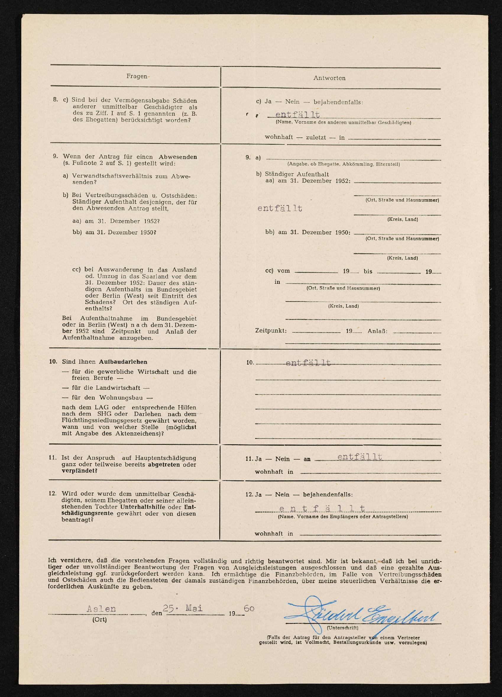 | Beschreibung | Antrag auf Zuerkennung von Hauptentschädigung nach dem Lastenausgleichsgesetz, Engelbert Pölderl, Aktenzeichen F 38-1/760, Aalen, 25. Mai 1960 |