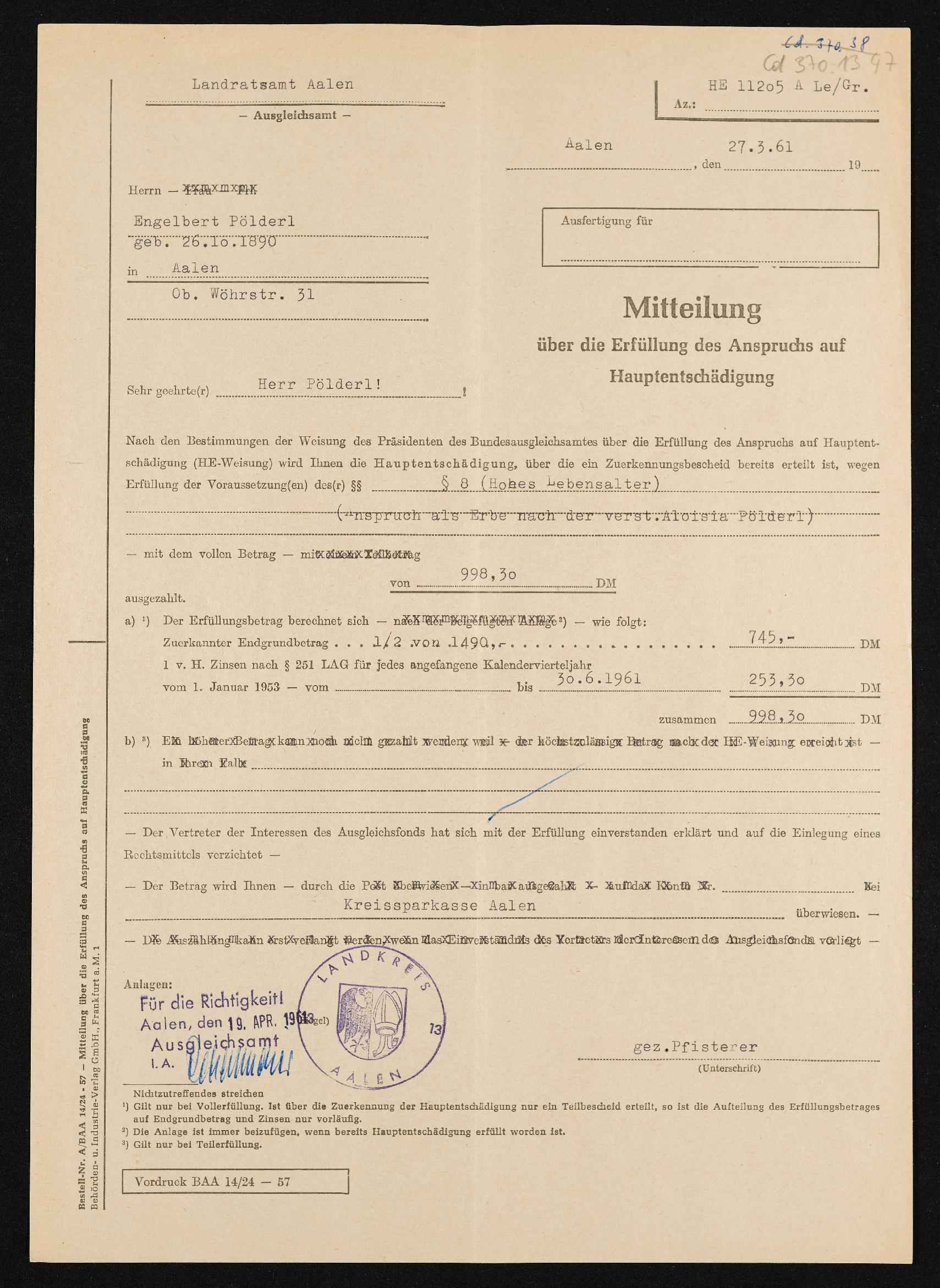 | Beschreibung | Mitteilung über die Erfüllung des Anspruchs auf Hauptentschädigung, Engelbert Pölderl, Landratsamt Aalen, 27. März 1961 |