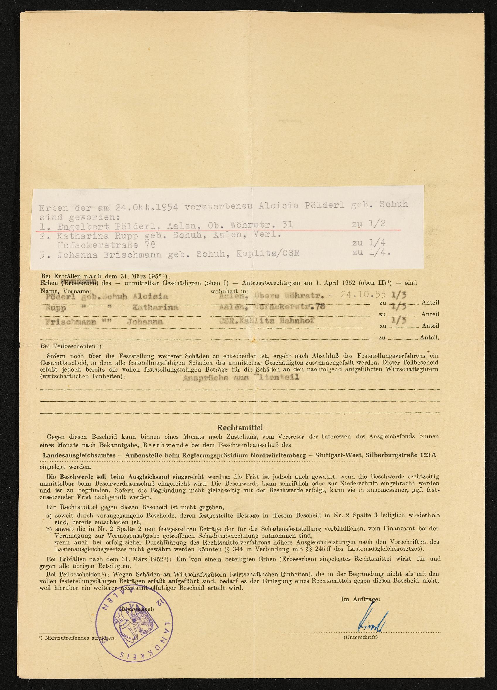 | Beschreibung | Teilbescheid über die Schadensfestellung nach dem Feststellungsgesetz, Engelbert Pölderl, Landratsamt Aalen den 15. November 1957 |