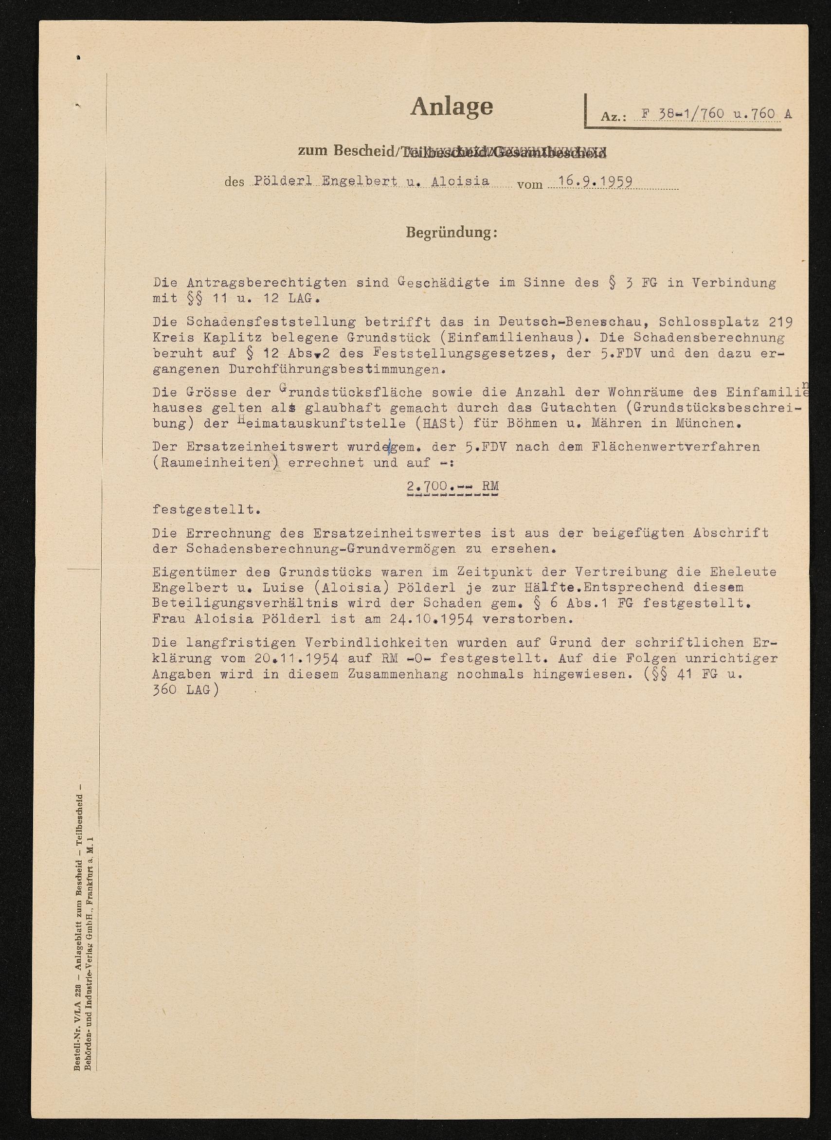 | Beschreibung | Beischeid über die einheitliche Schadensfeststellung nach dem Feststellungsgesetz, Johanna Frischmann, Landratsamt Aalen, 16. September 1959, Anlage zum Bescheid |