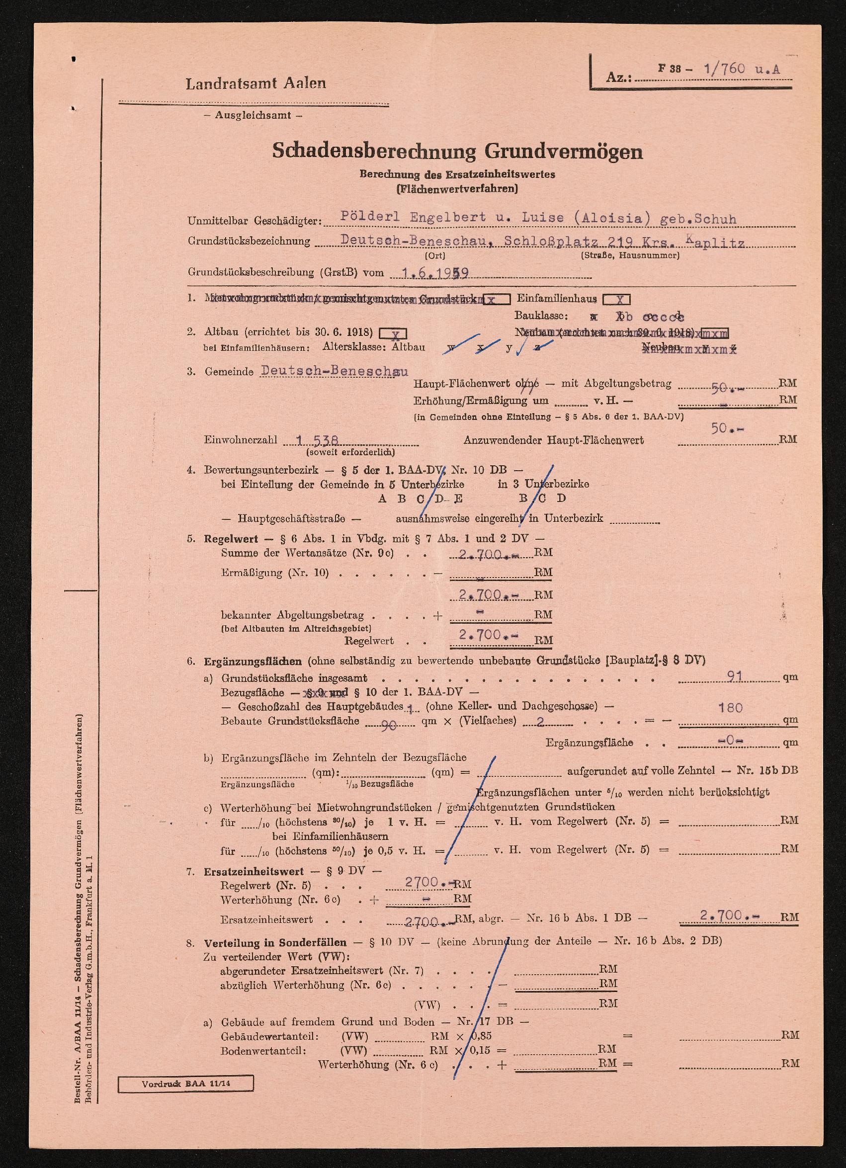 | Beschreibung | Schadensberechnung Grundvermögen, Unmittelbar Geschädigter: Engelbert und Aloisia Pölderl (geb. Schuh), Landratsamt Aalen |