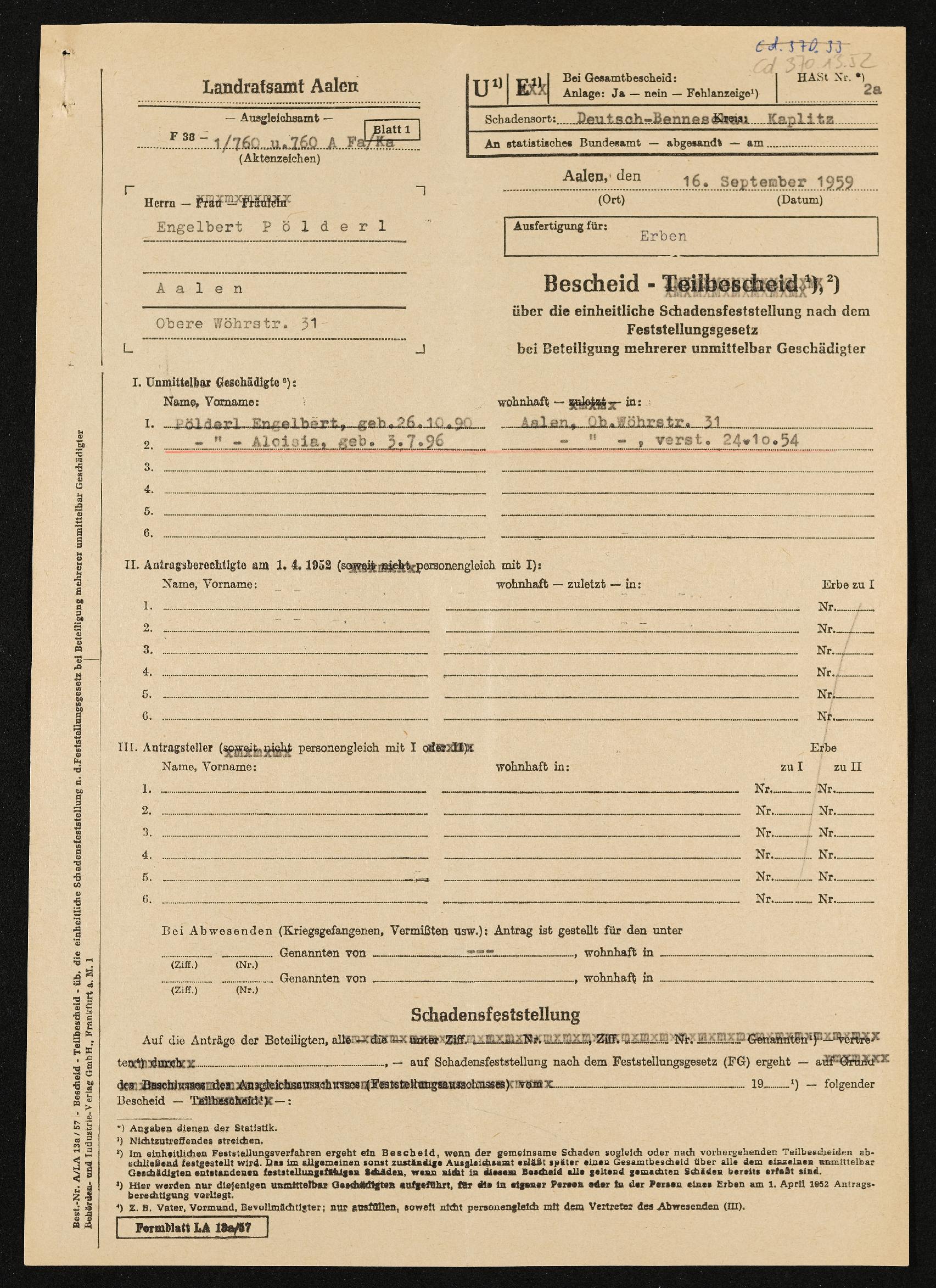 | Beschreibung | Bescheid für Engelbert und Aloisia Pölderl, Ausfertigung für Erben, Landratsamt Aalen, 16. September 1959 |