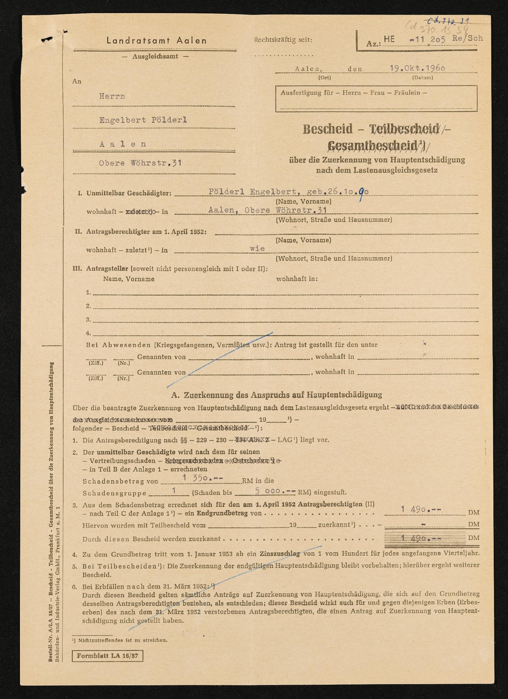 | Beschreibung | Bescheid über Zuerkennung von Hauptschädigung nach dem Lastenausgleichsgesetz, Engelbert Pölderl, Landratsamt Aalen, 19. Oktober 1960 |
