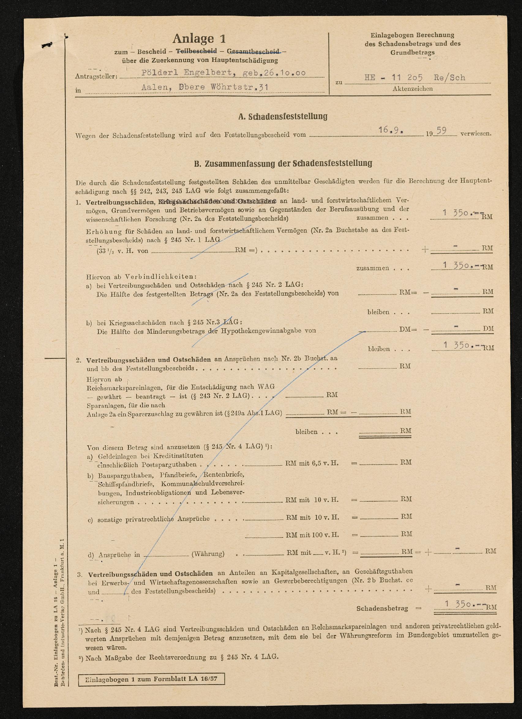 | Beschreibung | Bescheid über Zuerkennung von Hauptschädigung nach dem Lastenausgleichsgesetz, Engelbert Pölderl, Landratsamt Aalen, 19. Oktober 1960, Anlage 1 zum Bescheid, Schadensfeststellung vom 16. September 1959, Zusammenfassung der Schadensfeststellung |