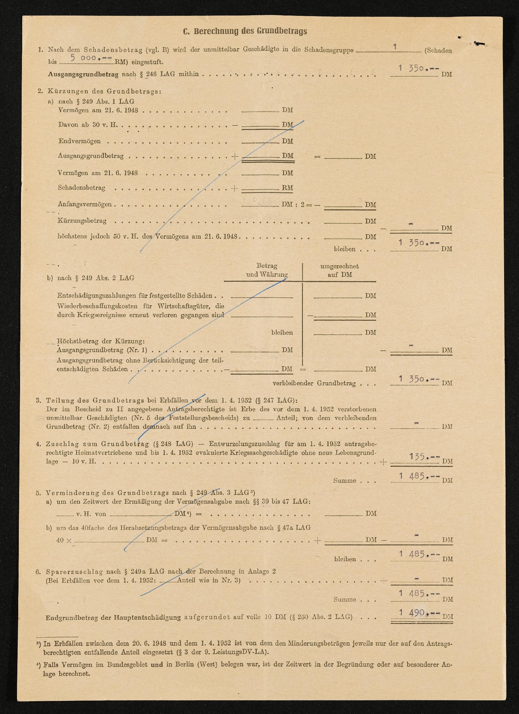 | Beschreibung | Bescheid über Zuerkennung von Hauptschädigung nach dem Lastenausgleichsgesetz, Engelbert Pölderl, Landratsamt Aalen, 19. Oktober 1960, Berechnung des Grundbetrages |