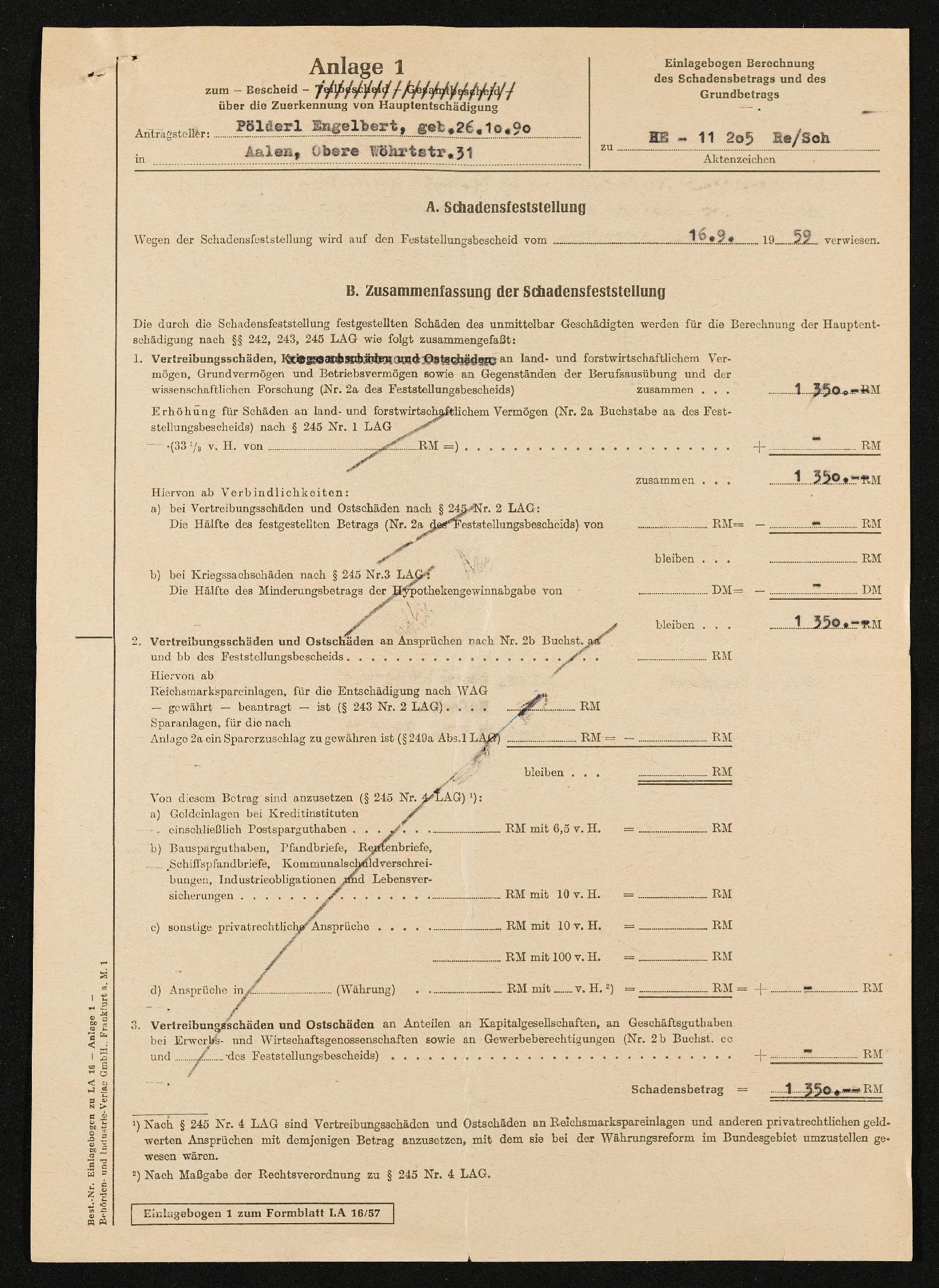 | Beschreibung | Bescheid über Zuerkennung von Hauptschädigung nach dem Lastenausgleichsgesetz, Johanna Frischmann, Landratsamt Aalen, 19. Oktober 1960, Anlage 1 zum Bescheid, Schadensfeststellung vom 16. September 1959, Zusammenfassung der Schadensfeststellung |