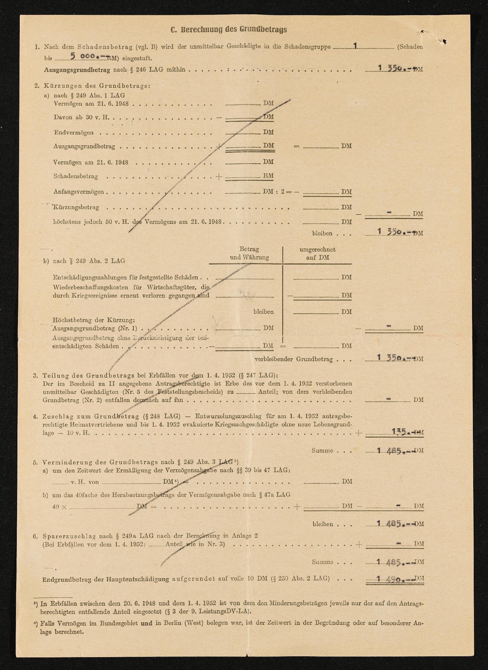 | Beschreibung | Bescheid über Zuerkennung von Hauptschädigung nach dem Lastenausgleichsgesetz, Johanna Frischmann, Landratsamt Aalen, 19. Oktober 1960, Berechnung des Grundbetrages |