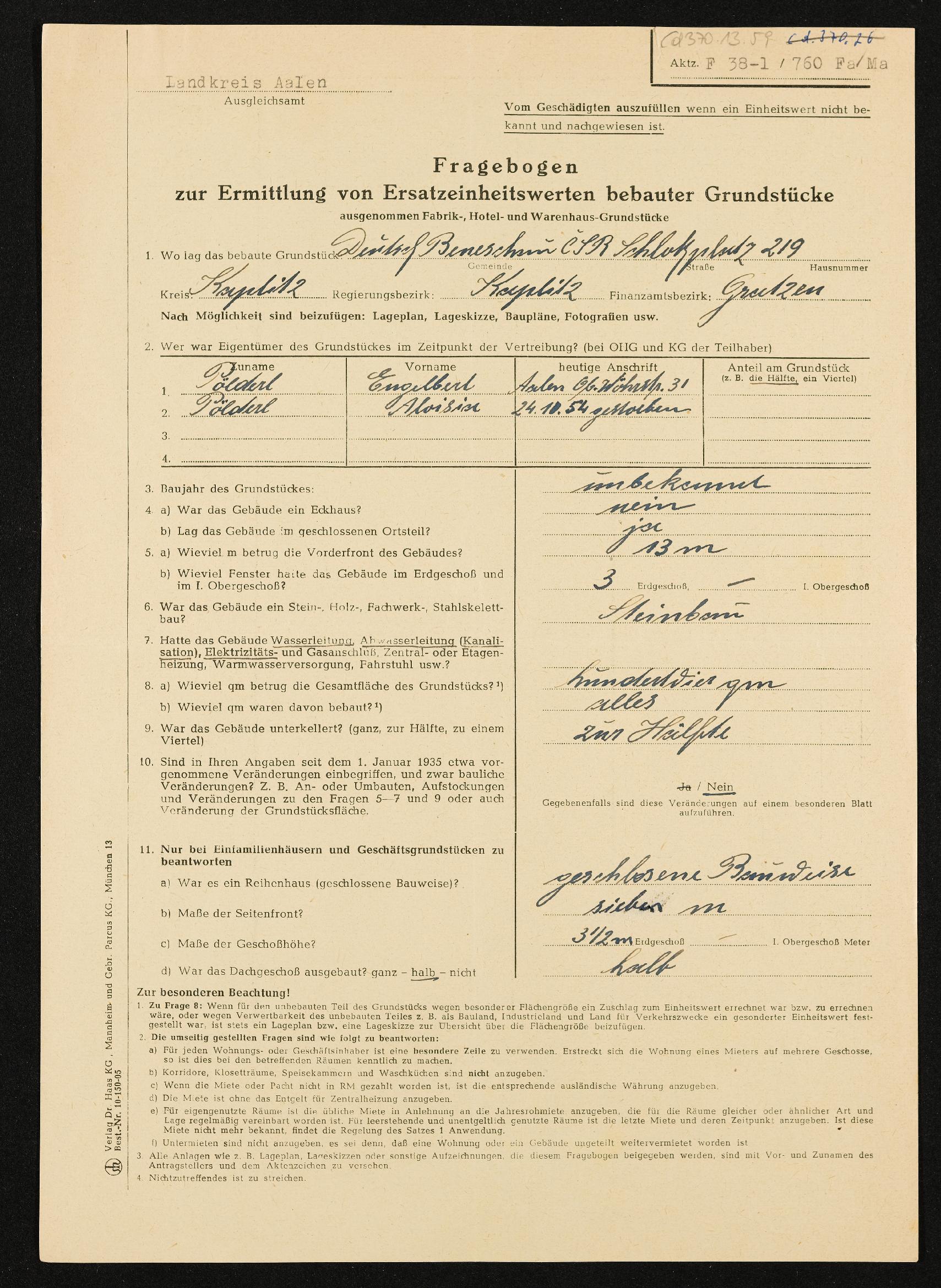 | Beschreibung | Fragebogen zur Ermittlung von Ersatzeinheitswerten bebauter Grundstücke, Eigentümer: Engelbert und Aloisia Pölderl, Aalen, 16. November 1954 |