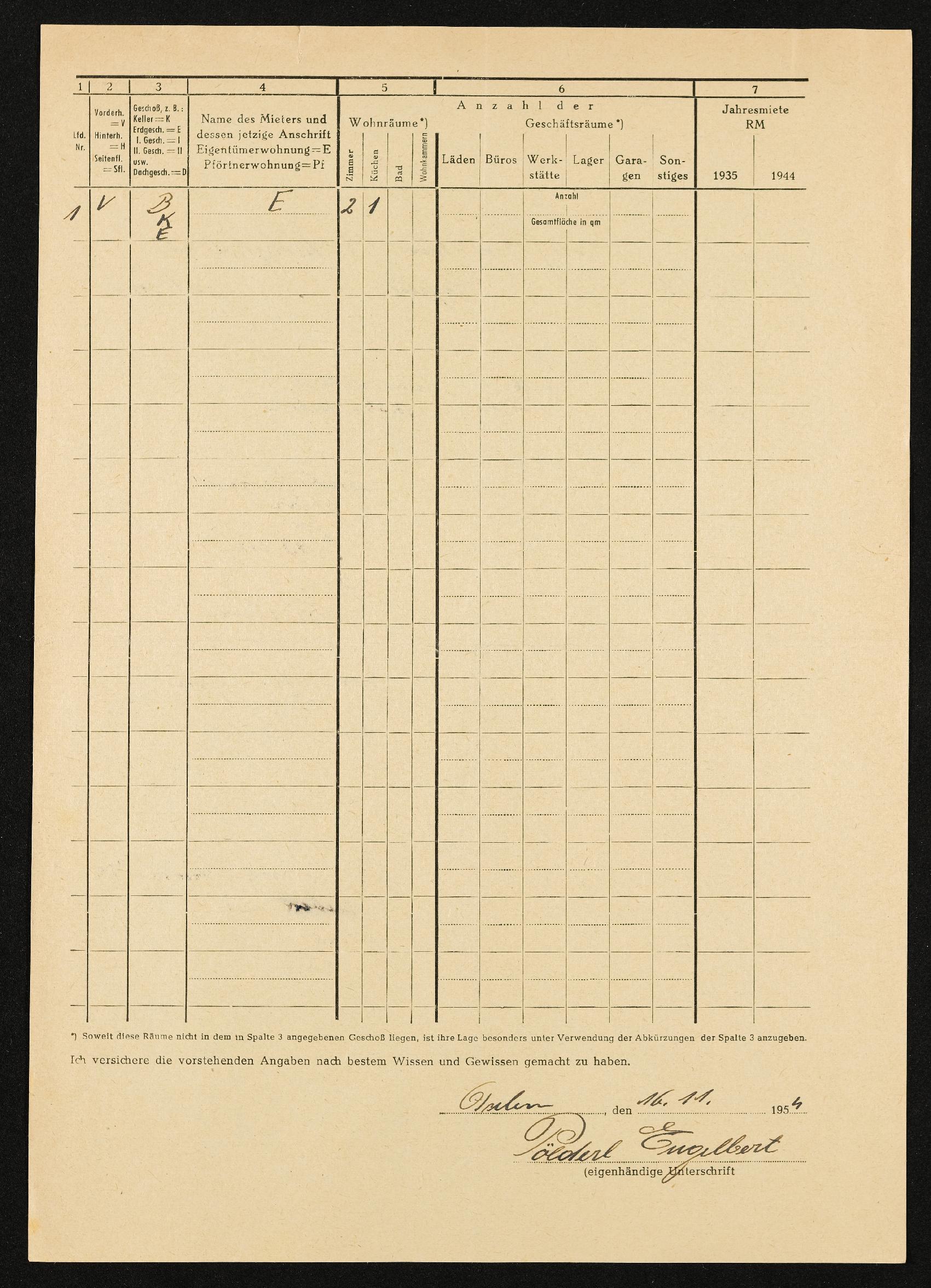 | Beschreibung | Fragebogen zur Ermittlung von Ersatzeinheitswerten bebauter Grundstücke, Eigentümer: Engelbert und Aloisia Pölderl, Aalen, 16. November 1954 |