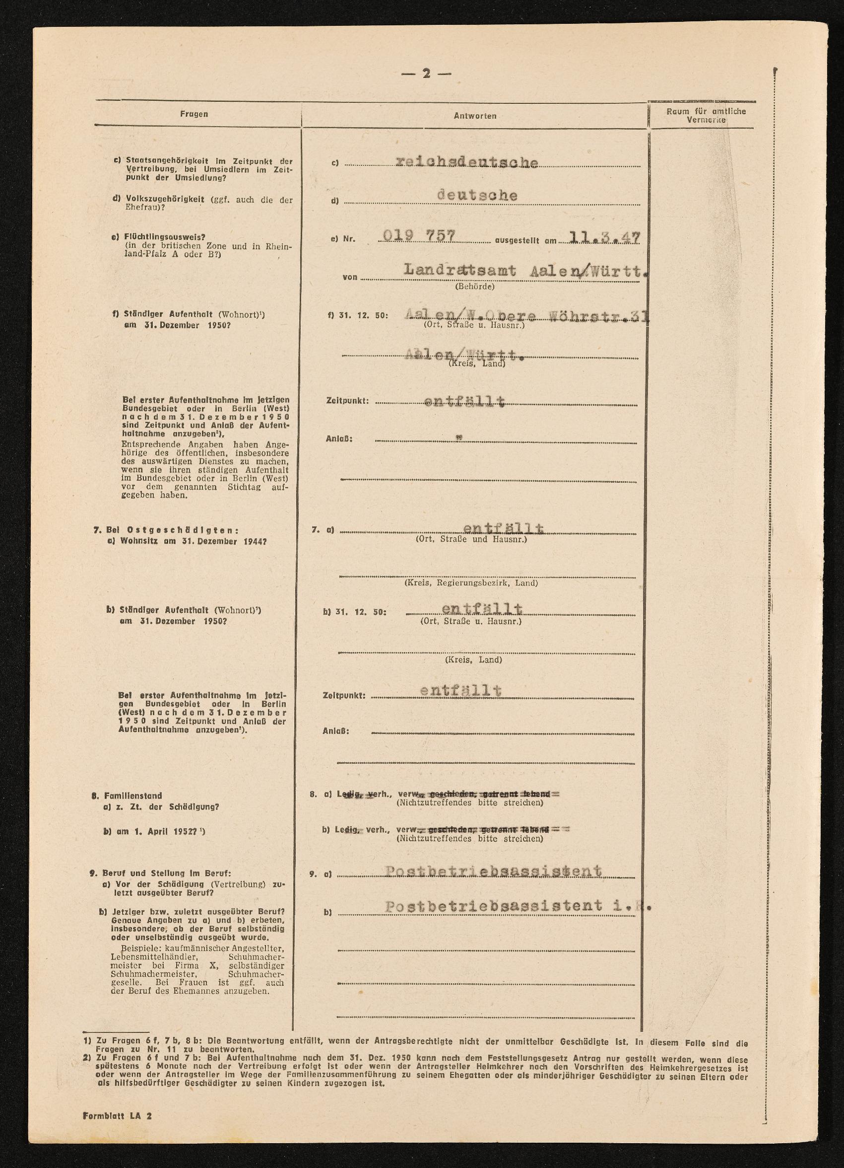 | Beschreibung | Antrag auf Feststellung von Verteibungsschäden, Kriegsschäden, Ostschäden, Engelbert Pölderl, Aalen, 5. Dezember 1952 |