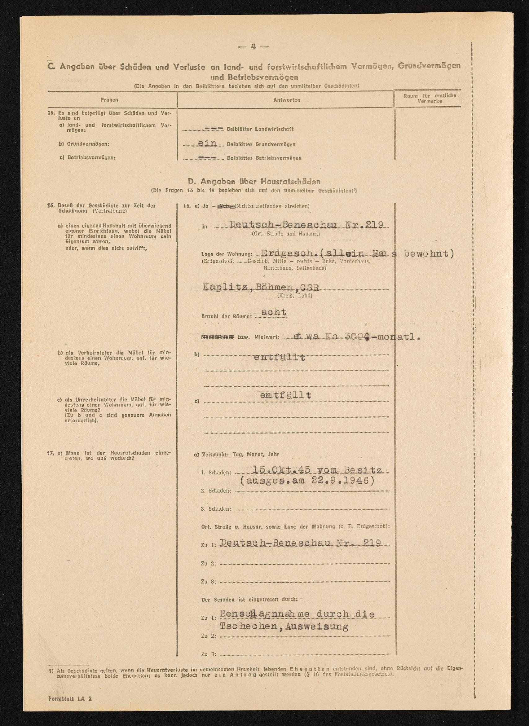 | Beschreibung | Antrag auf Feststellung von Verteibungsschäden, Kriegsschäden, Ostschäden, Engelbert Pölderl, Aalen, 5. Dezember 1952 |