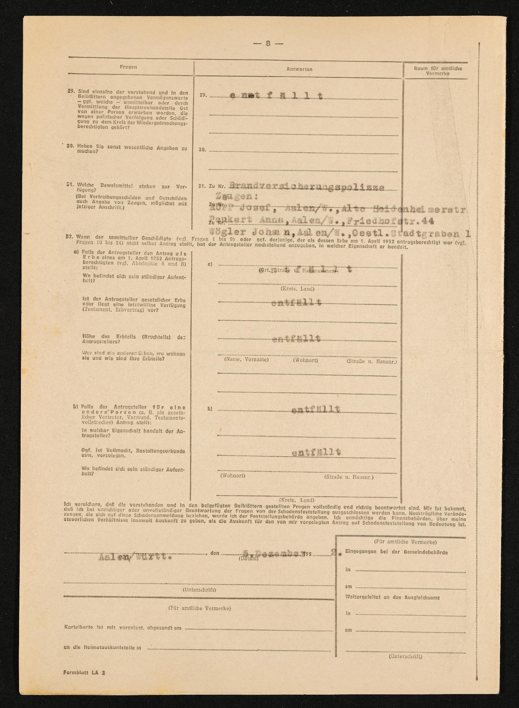 | Beschreibung | Antrag auf Feststellung von Verteibungsschäden, Kriegsschäden, Ostschäden, Engelbert Pölderl, Aalen, 5. Dezember 1952 |