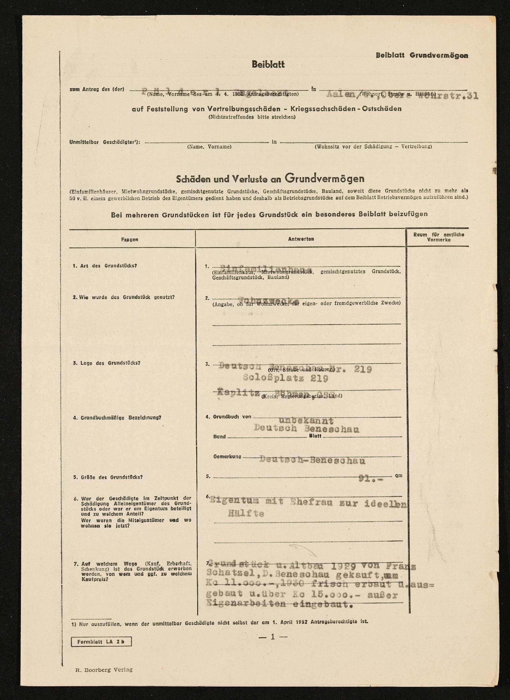 | Beschreibung | Antrag auf Feststellung von Verteibungsschäden, Kriegsschäden, Ostschäden, Engelbert Pölderl, Aalen, 5. Dezember 1952 |