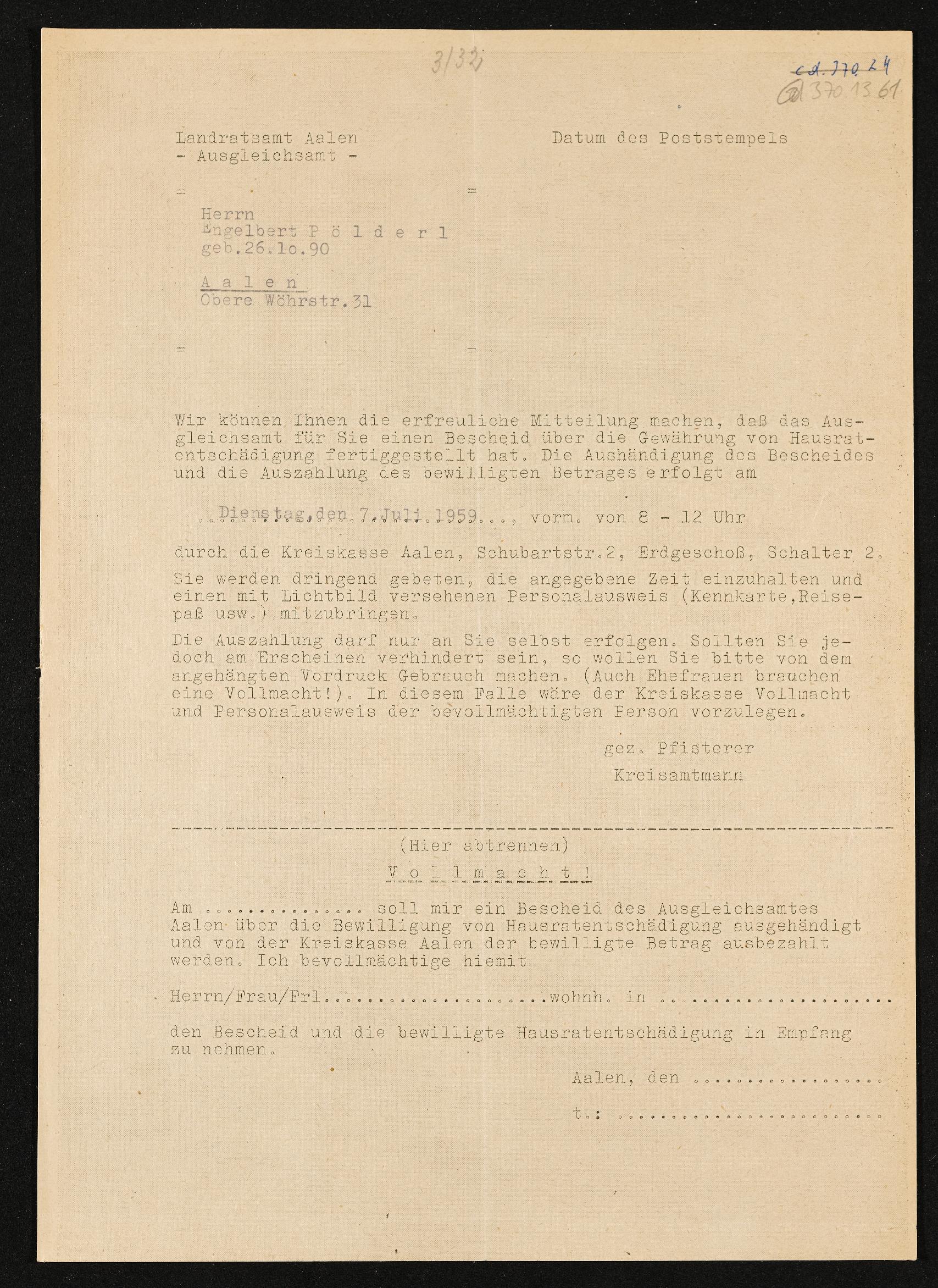 | Beschreibung | Mitteilung über Aushändigung des Bescheides und Auszahlung des bewilligten Betrages, Engelbert Pölderl, Landratsamt Aalen, Ausgleichsamt, erfolgt am 7. Juli 1959 |