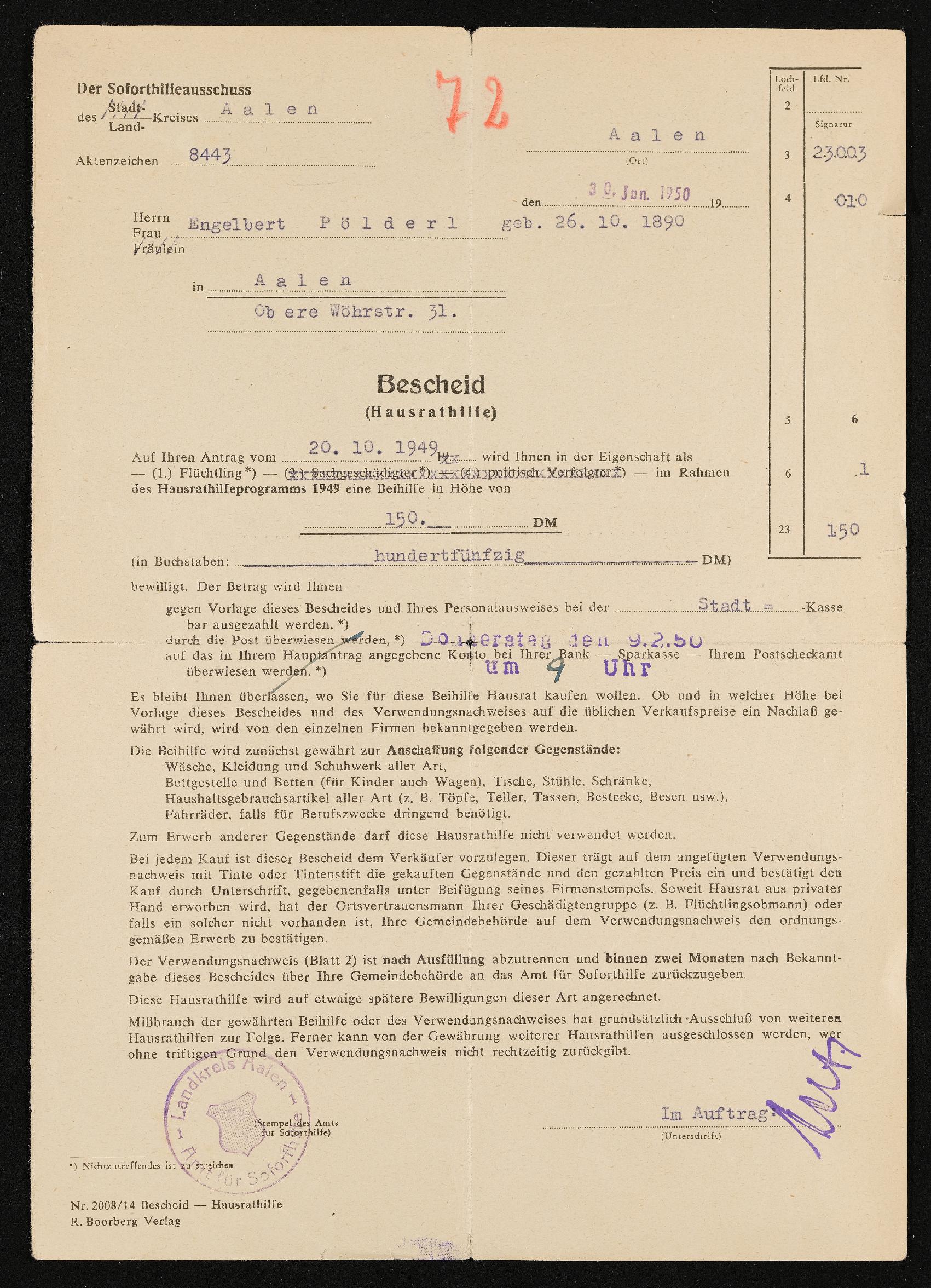 | Beschreibung | Beischeid Hausrathilfe, Engelbert Pölderl, Soforthilfeausschuss Landkreis Aalen, 30. Jänner 1950 |