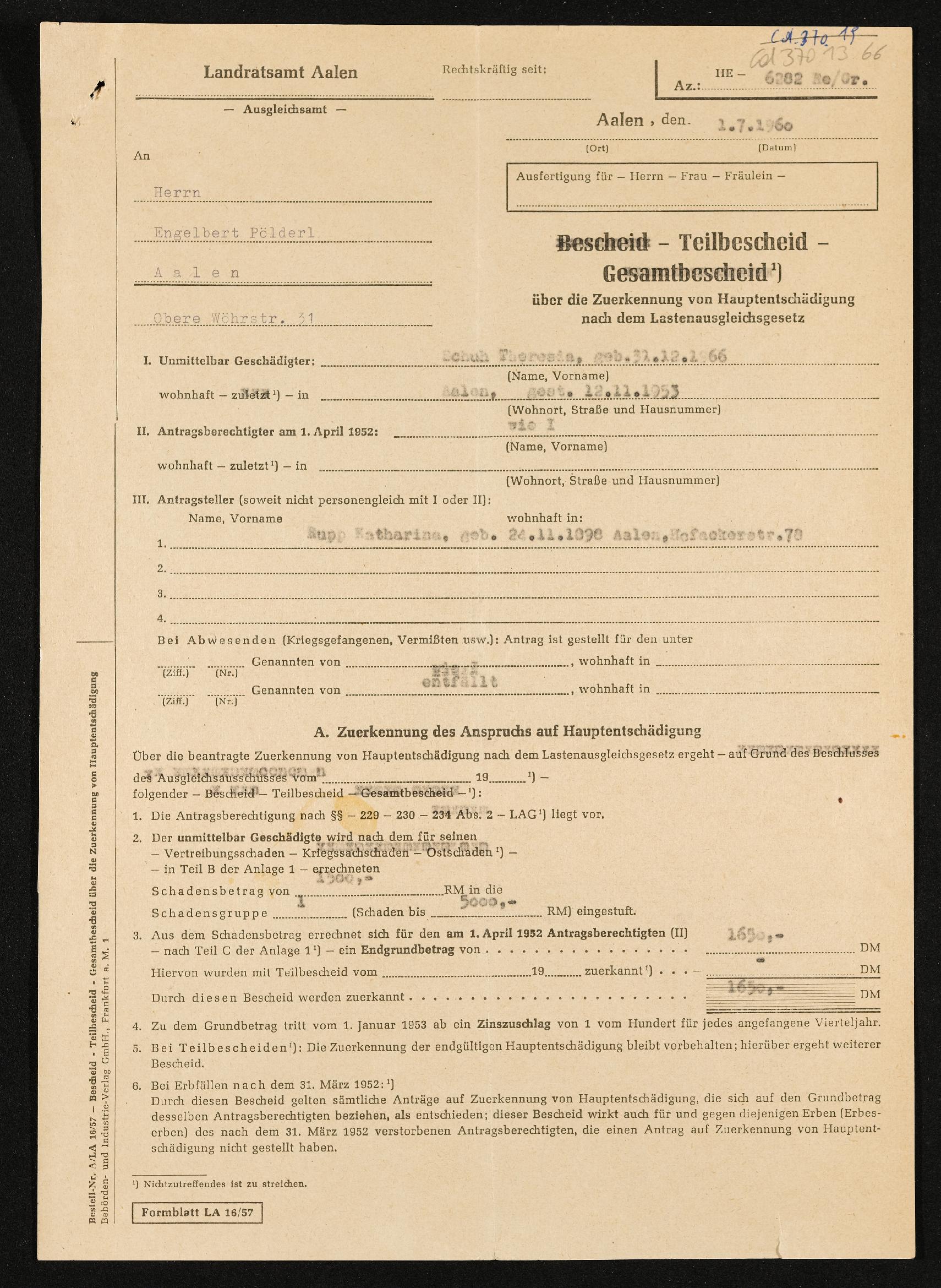 | Beschreibung | Teilbescheid über die Zuerkennung von Hauptentschädigung nach Lastenausgelichsgesetz, unmittelbar Geschädigte: Theresia Schuh, Antragsteller Katharina Rupp, Landratsamt Aalen, Ausgleichsamt, 1. Juli 1960 |
