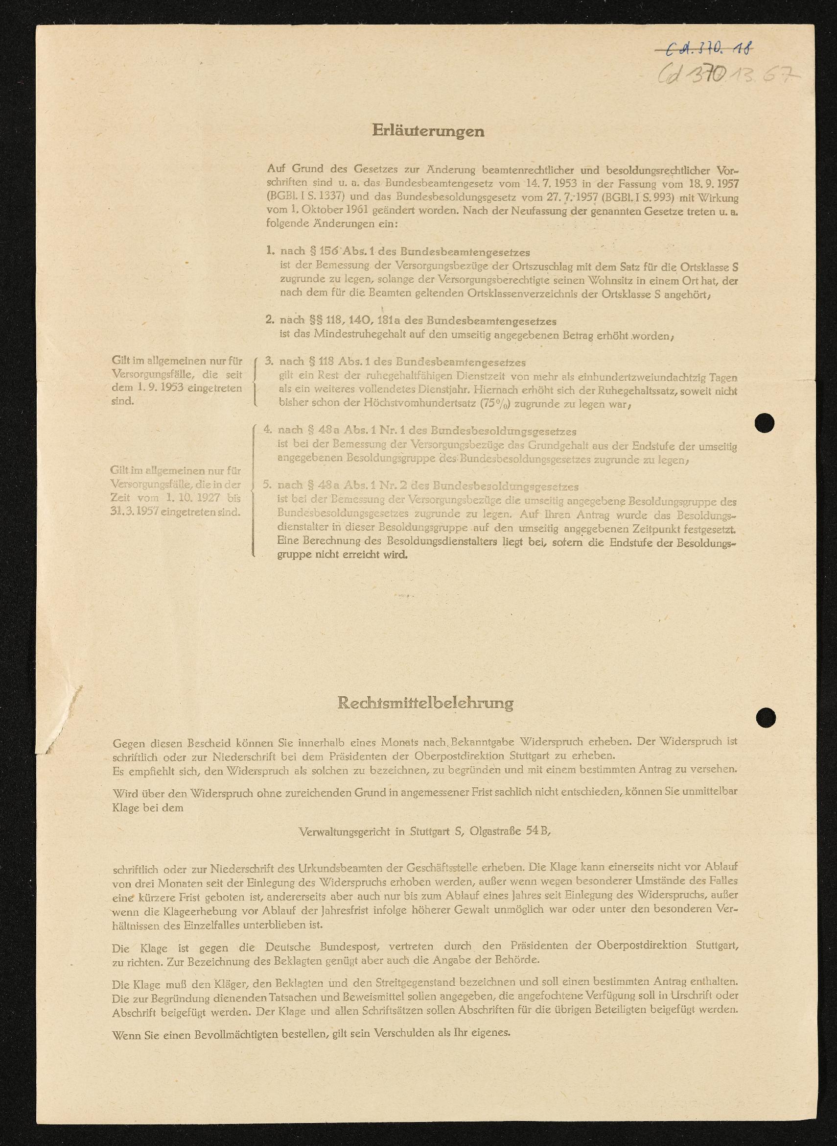 | Beschreibung | Bescheid über die Neufestsetzung der Versorgungsbezüge, Postbetriebsassistent a.D. Engelbert Pölderl, Oberpostdirektion Stuttgart, 12. Jänner 1962 |