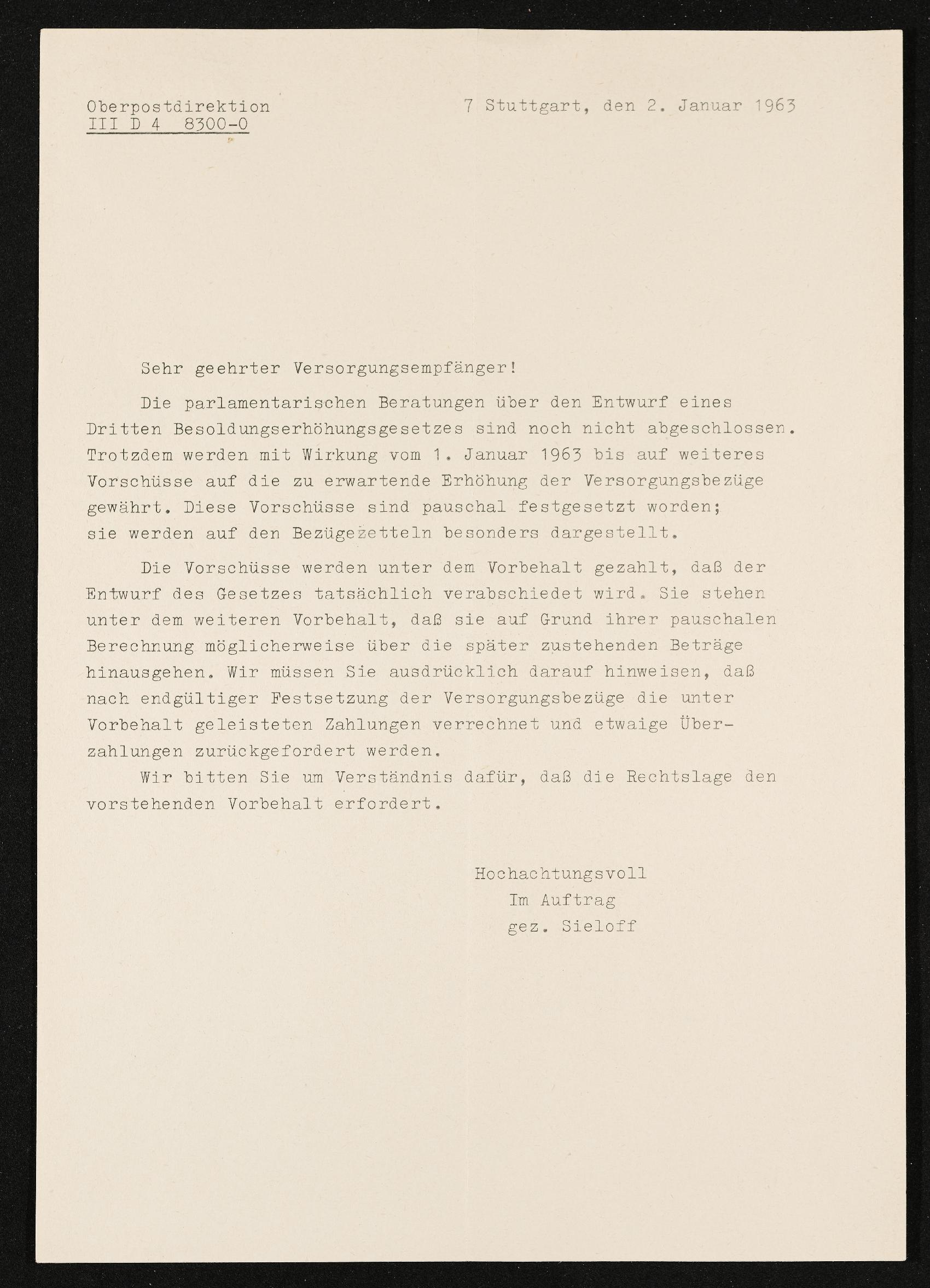 | Beschreibung | Mittelung über Vorschüsse auf die zu erwartende Erhöhnung der Versorgungsbezüge, Postbetriebsassistent a. D. Engelbert Pölderl, Oberpostdirektion, Stuttart 2. Jänner 1963 |