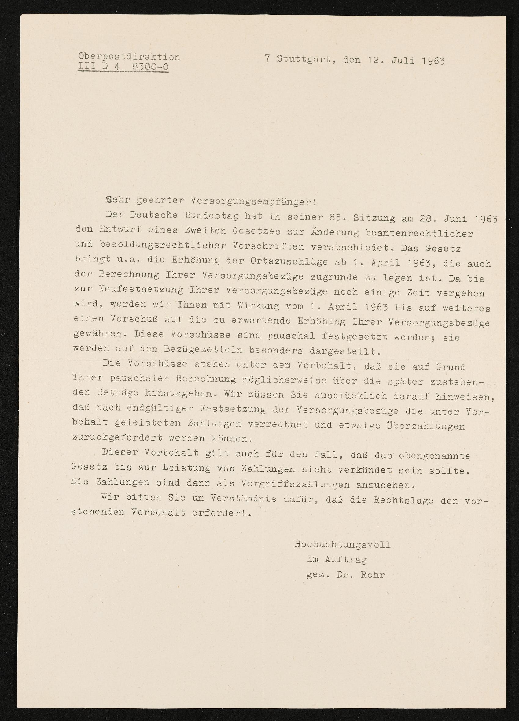 | Beschreibung | Mittelung über gesetzliche Erhöhung der Versorgungsbezüge, Postbetriebsassistent a. D. Engelbert Pölderl, Oberpostdirektion, Stuttart 12. Juli 1963 |