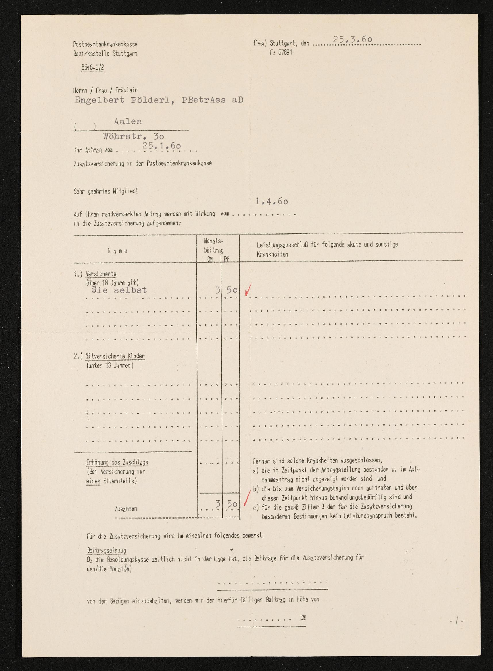 | Beschreibung | Aufnahme in die Zusatzversicherung ab 1. April 1960, Postbetriebsassistent a.D. Engelbert Pölderl, Postbeamtenkrankenkasse, Bezirksstelle Stuttgart, 25. März 1960 |